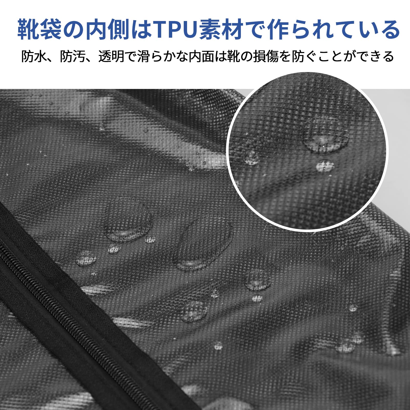 【防水・防塵・防汚】靴袋の表面はメッシュ素材で、シューズ ケースの通気性を高めます。内側はTPU素材で作られており、汚れを防ぎ、透明で滑らかな内面は靴の損傷を防ぐことができます。高品質の素材を採用して、防水防塵防汚、軽く、耐久性をするとともに柔軟性を兼ね備えています。