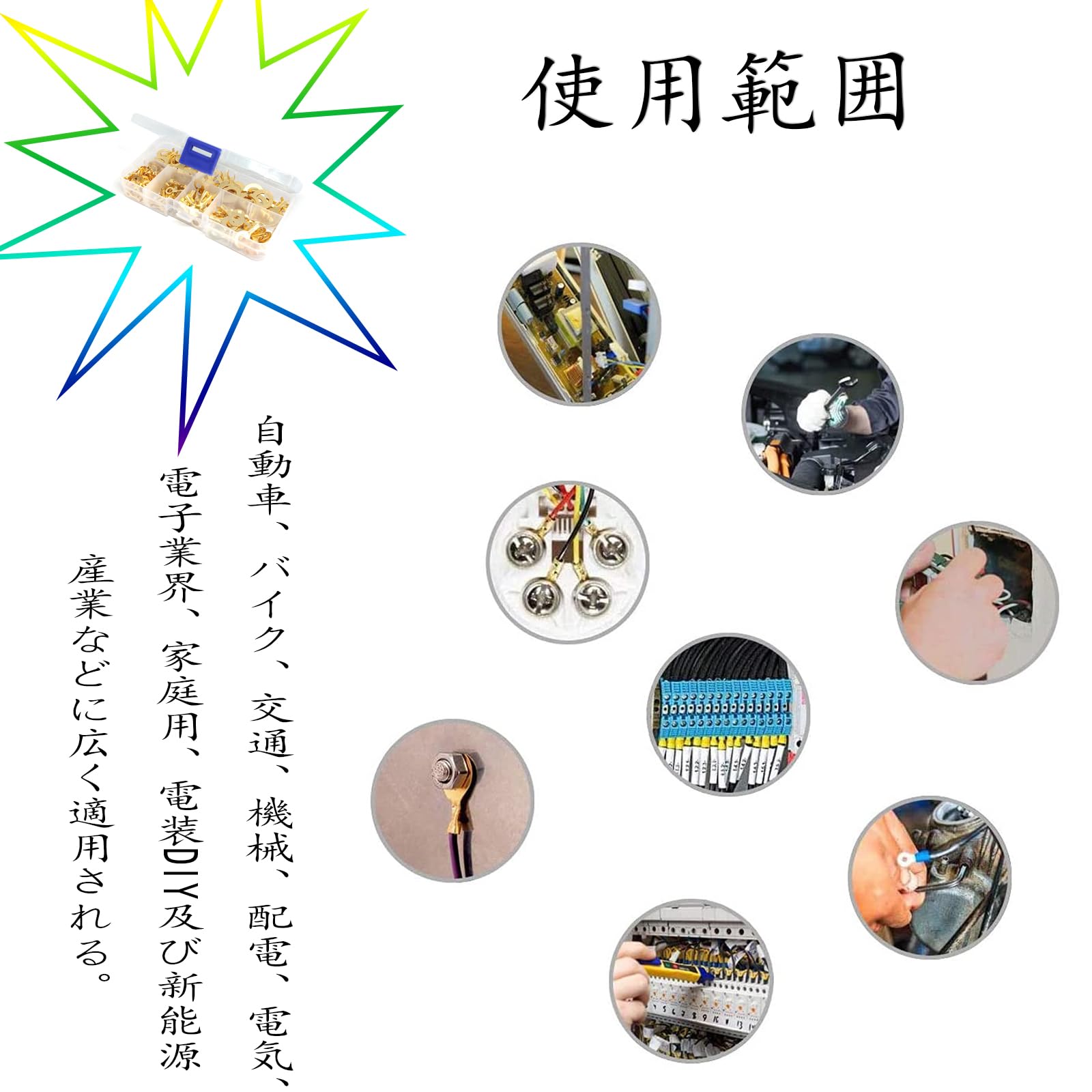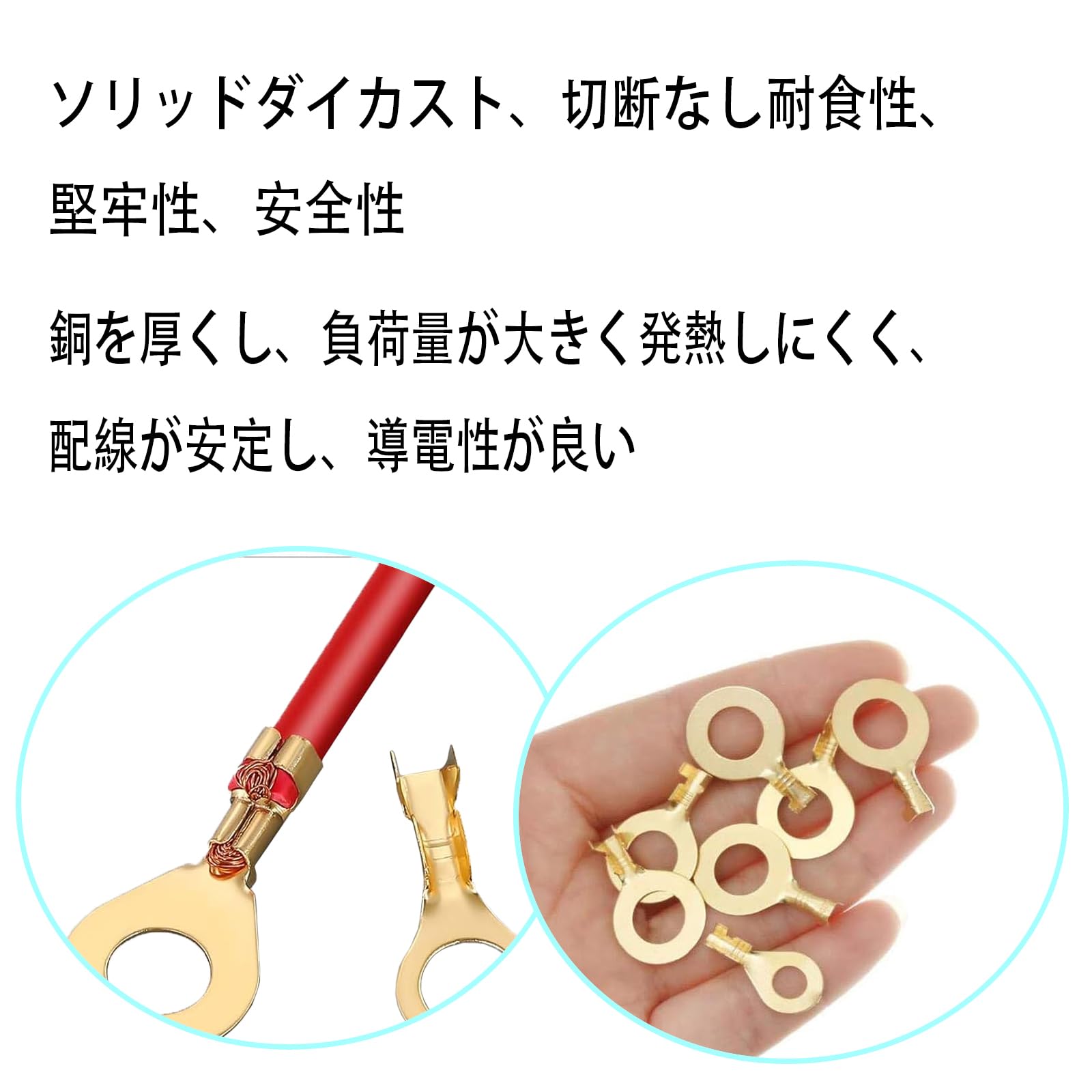 【パケージ内容】:丸型端子・150pcsセット。収納ケース*1個。(端子を整理して分類し、持ち運びや取り出しが容易になります。)商品仕様:箱サイズ:約125*63mm、色:ゴールド、丸型端子数量M3 (50pcs)、 M4(20pcs)、 M5(20pcs)、M6(20pcs)、M8(20pcs)、M10(20pcs)、6種類、合計150pcs。