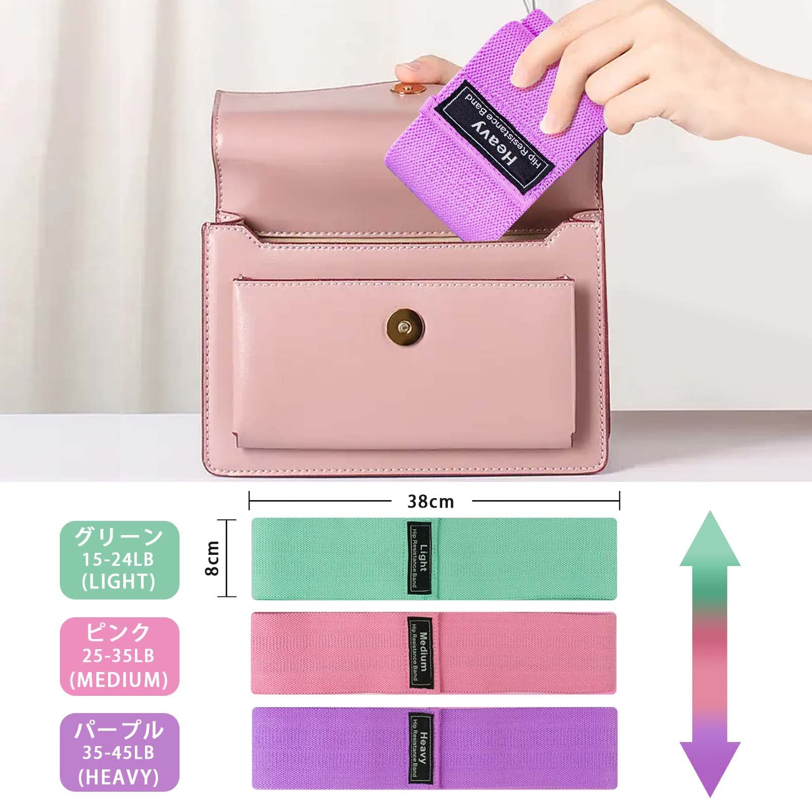 【3つの強さ・簡単トレーニング ゴムバンド】美尻バンドの構造と天然ラテックス素材の含有量によりバンドの強さが異なります。◆弱:薄い灰色(15〜24ポンド)◆中:灰(25〜35ポンド)◆強:黒(35〜45ポンド)。初心者から上級者までトレーニングに使用でき、またトレーニングの進捗や部位によりバンドを交換することで長く、より広い部位に対応することができます。