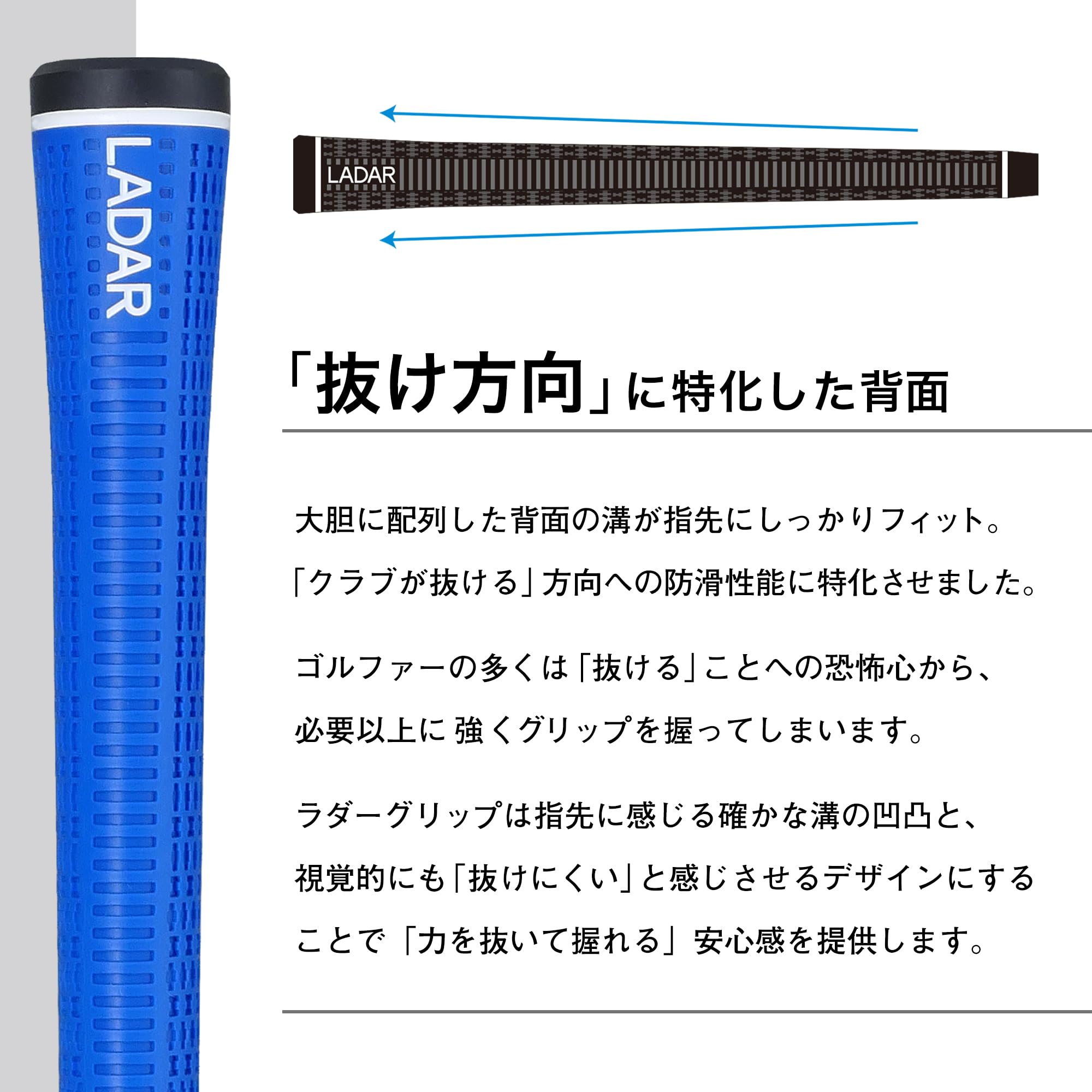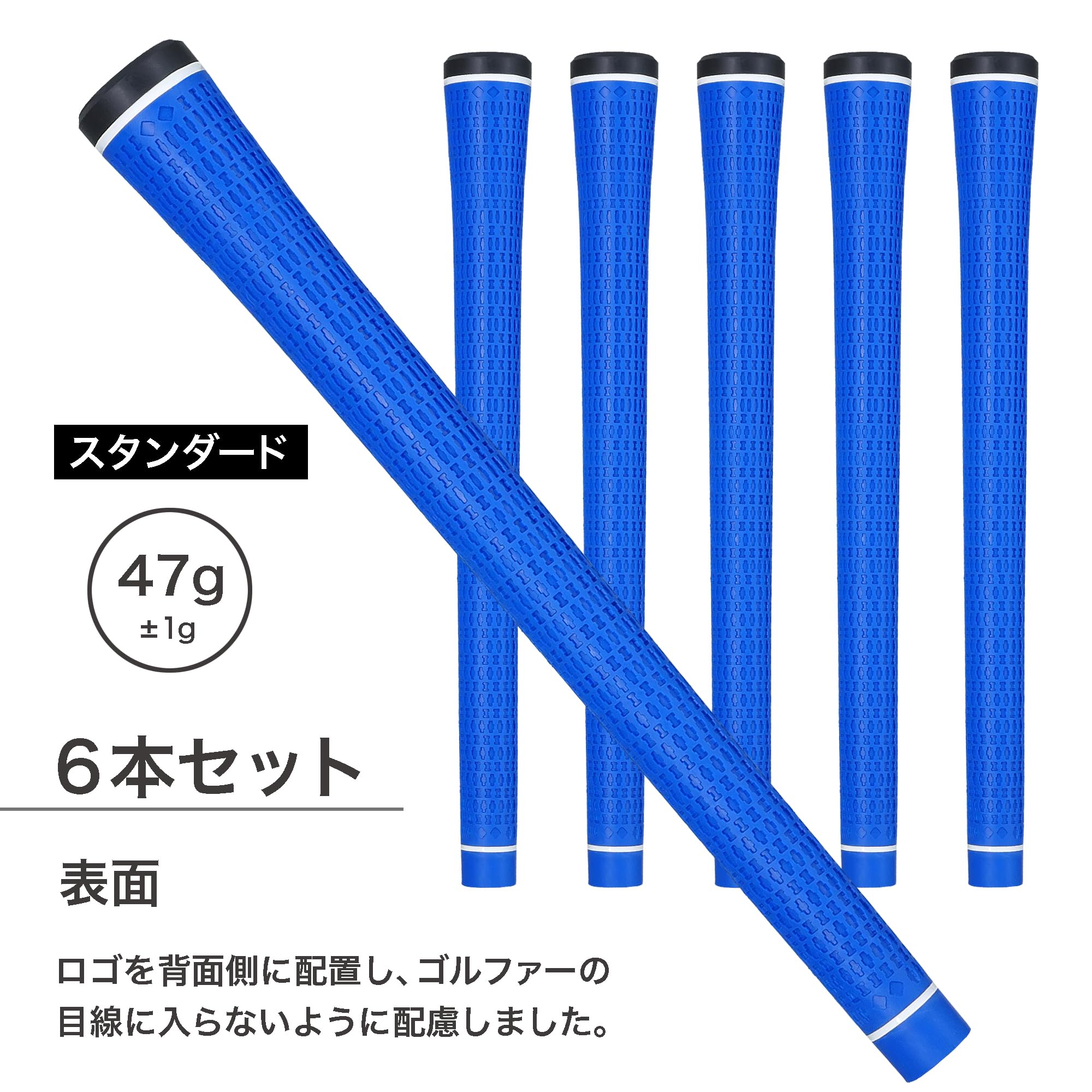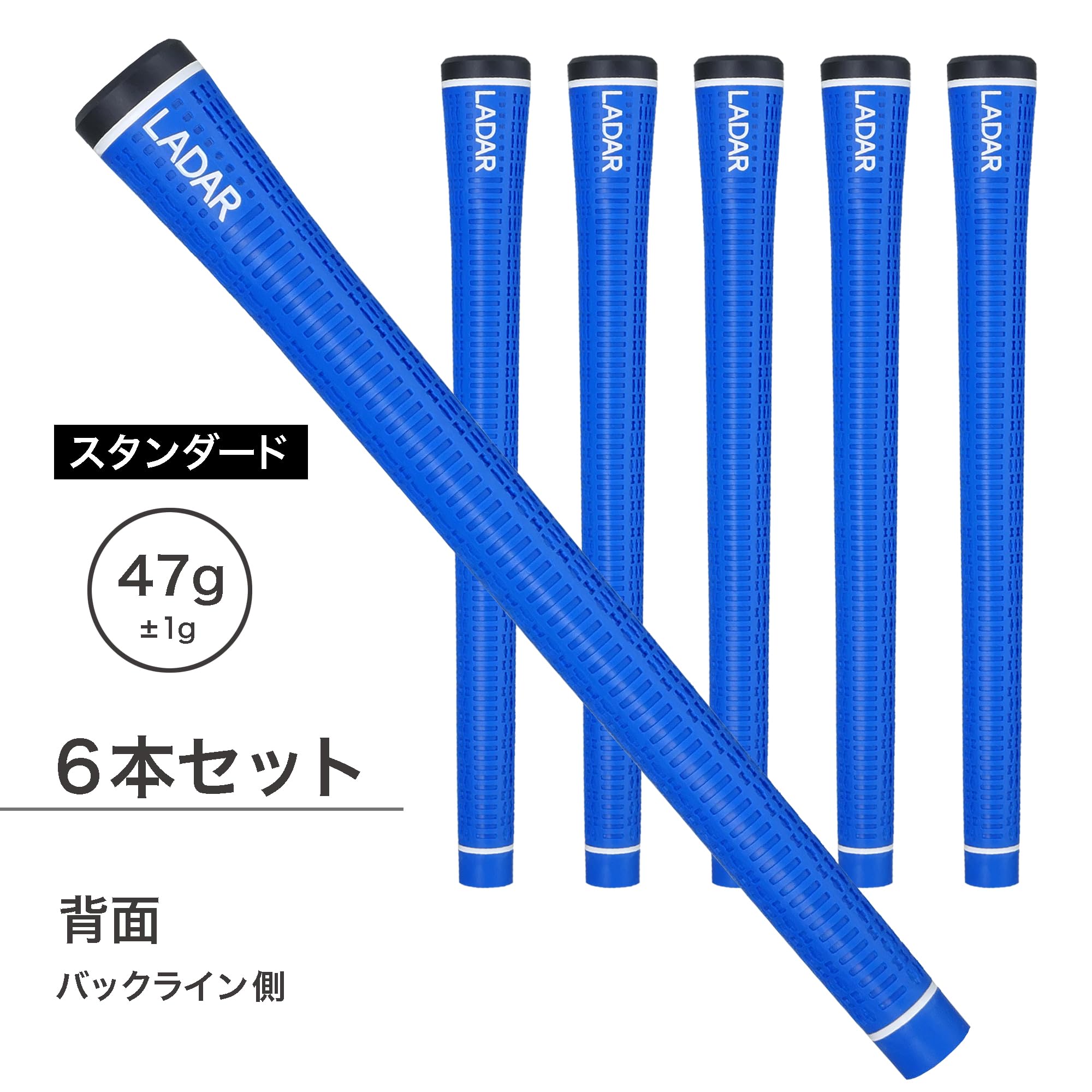 LADAR GRIP ラダーグリップ スタンダード 6本セット Made in Japan 1本あたり 重量:47g ±1g 口径:M60 バックラインあり 素材:エラストマー(熱可塑性樹脂) 硬度:55 ルール適合 ブランド LADAR(ラダー) 色 ブルー グリップタイプ バックラインあり グリップサイズ M60 LADAR(ラダー)