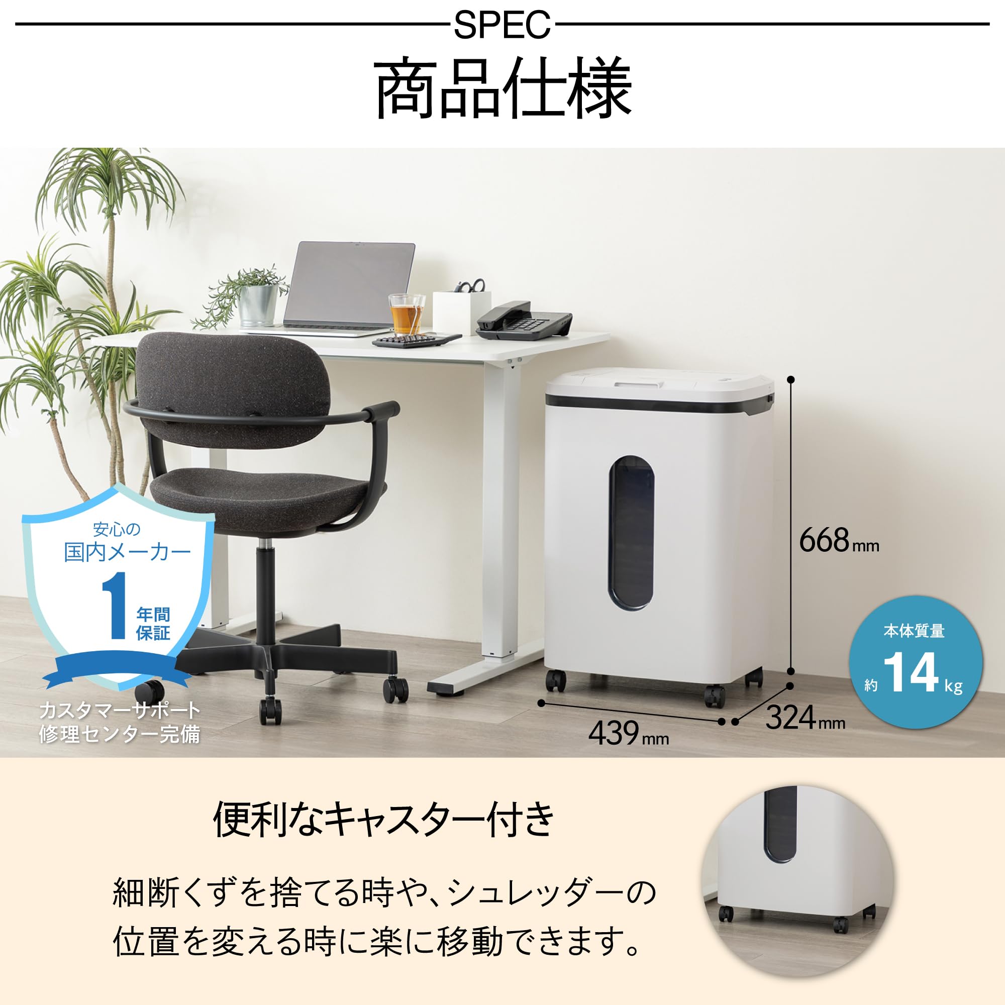 〈商品仕様〉オートフィードセット枚数:250枚、細断寸法:2×13mmマイクロカット、ダストボックス容量:約30L、定格使用時間:30分、外形寸法:W439×D324×H668mm、質量:約14㎏