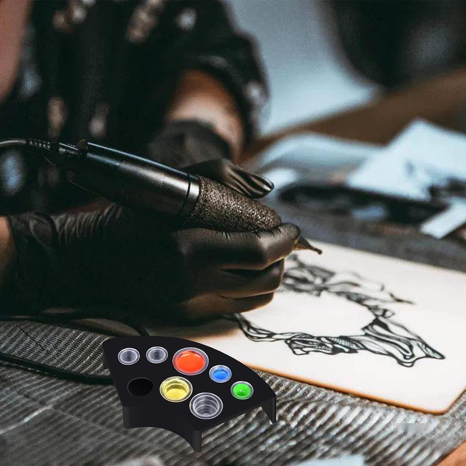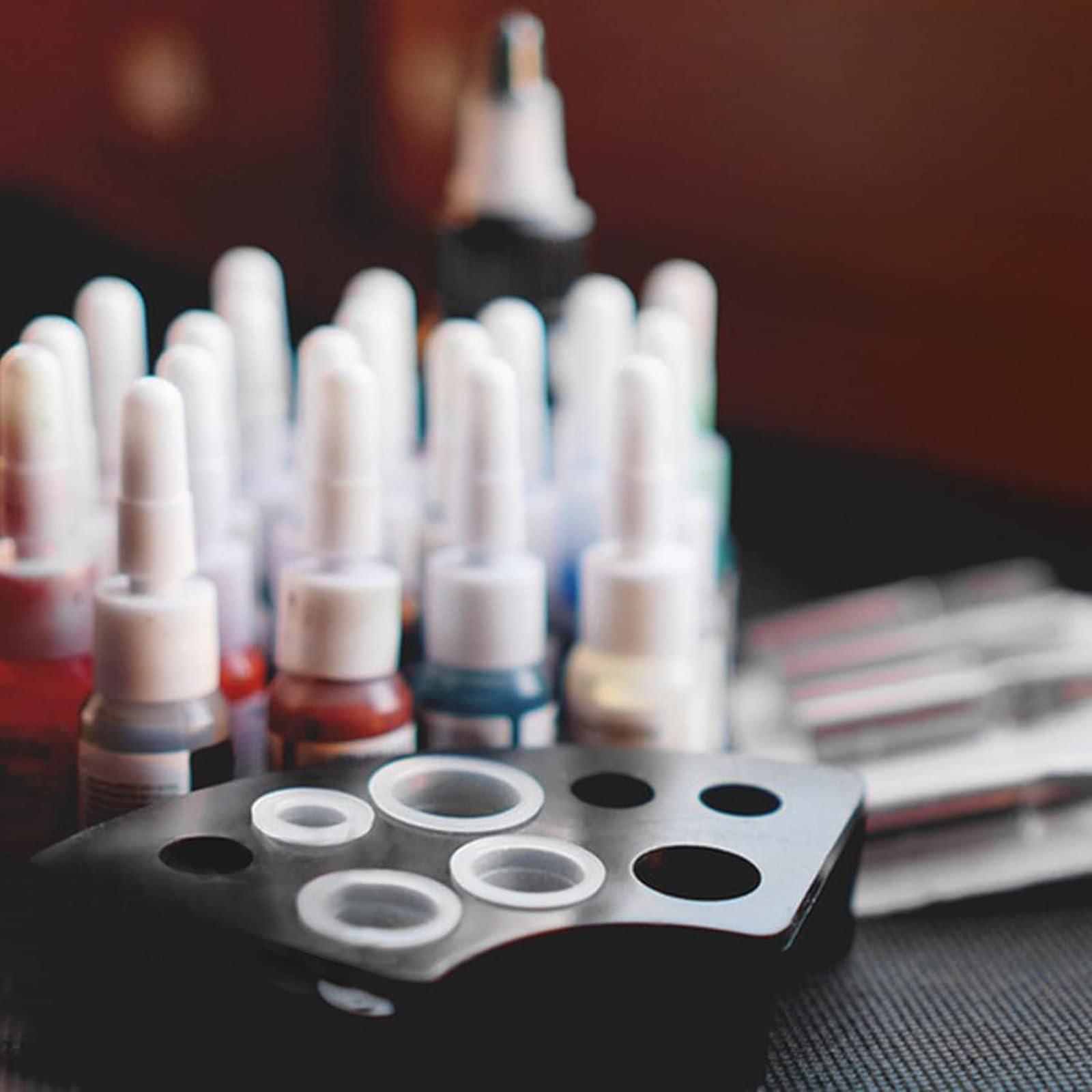 [インクキャップホルダー] - 各インクキャップホルダーは8つの穴で設計されています。 穴の大きさは様々です。 つのホルダーに小4個、中3個、大1個のタトゥーキャップを同時に収納できます。 タトゥーインクキャップホルダー] - 各インクキャップホルダーには8つの穴が開いています。