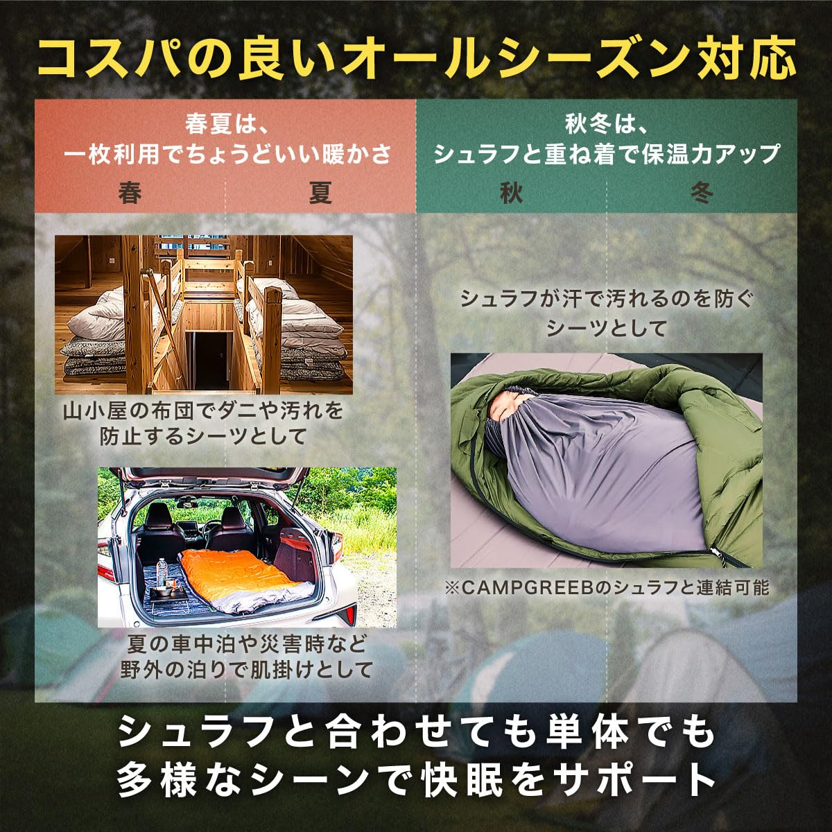 【厳選した素材・多機能】CAMPGREEB独自の特殊素材で、防菌・防ダニはもちろん、寝心地の良い肌触り!!