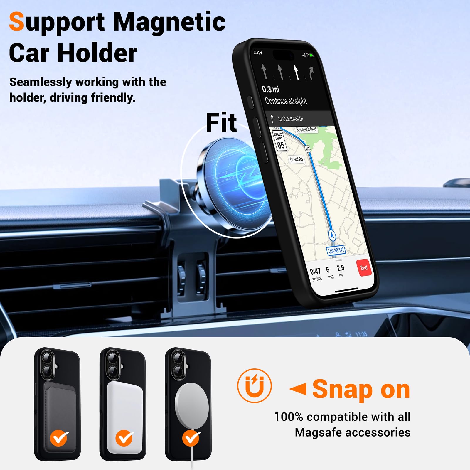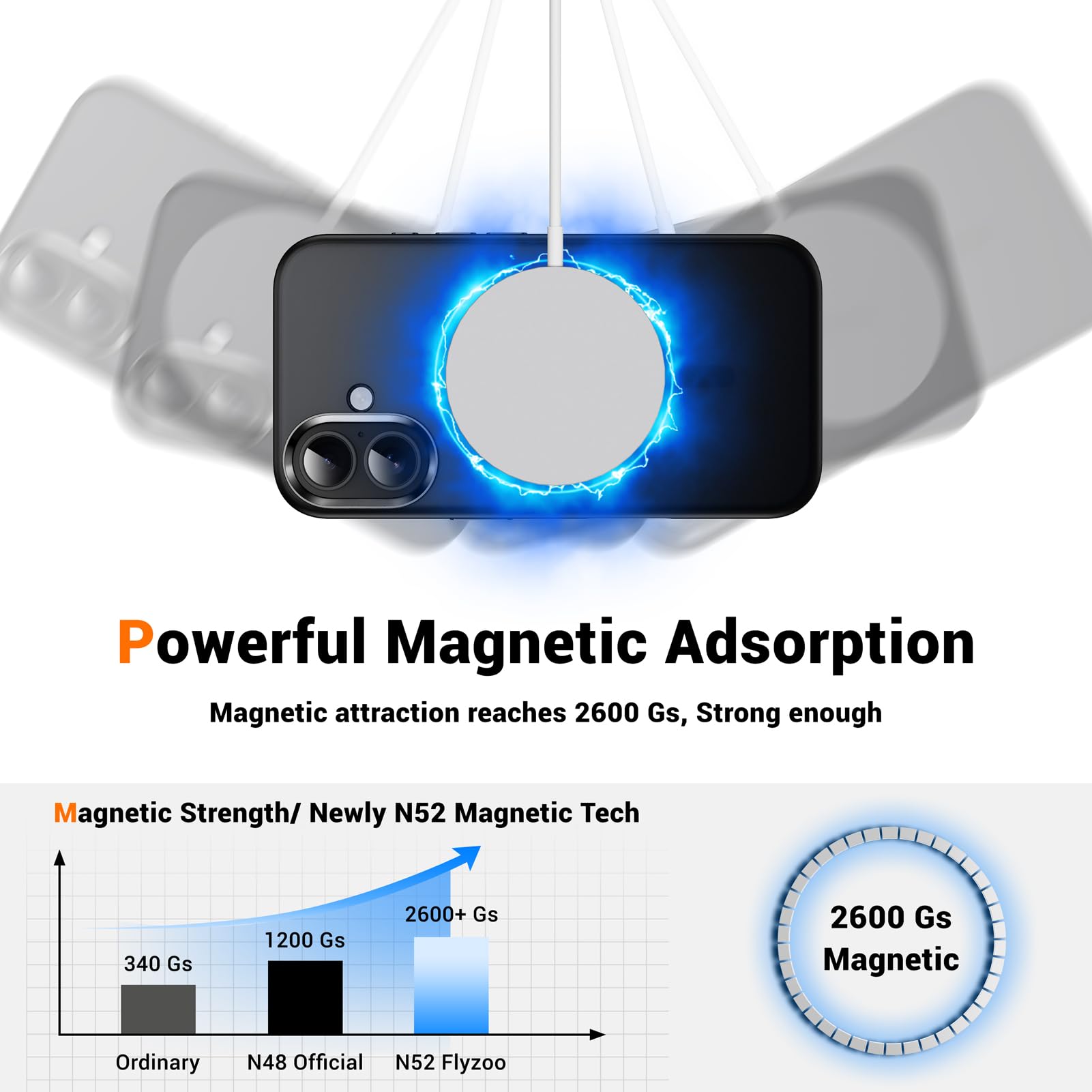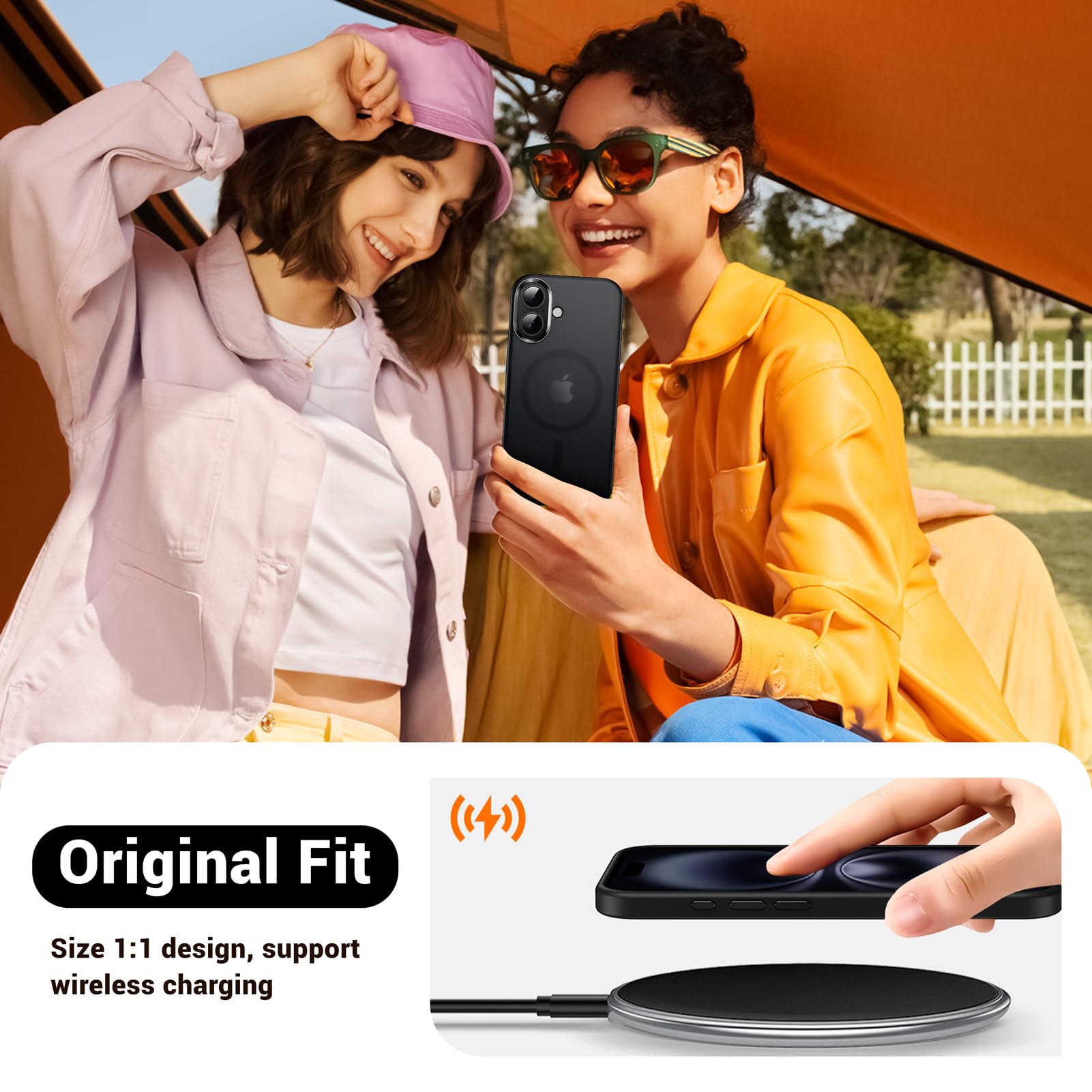 Flyzoo用のiPhone 16磁気ット式マットケース MagSafe対応 米軍MIL規格 耐衝撃 ワイヤレス充電 指紋防止 耐黄変 擦り傷防止 薄型で半透明の超軽量シリコーン電話カバー マグネットスマホケース, 6.1インチ、ブラック