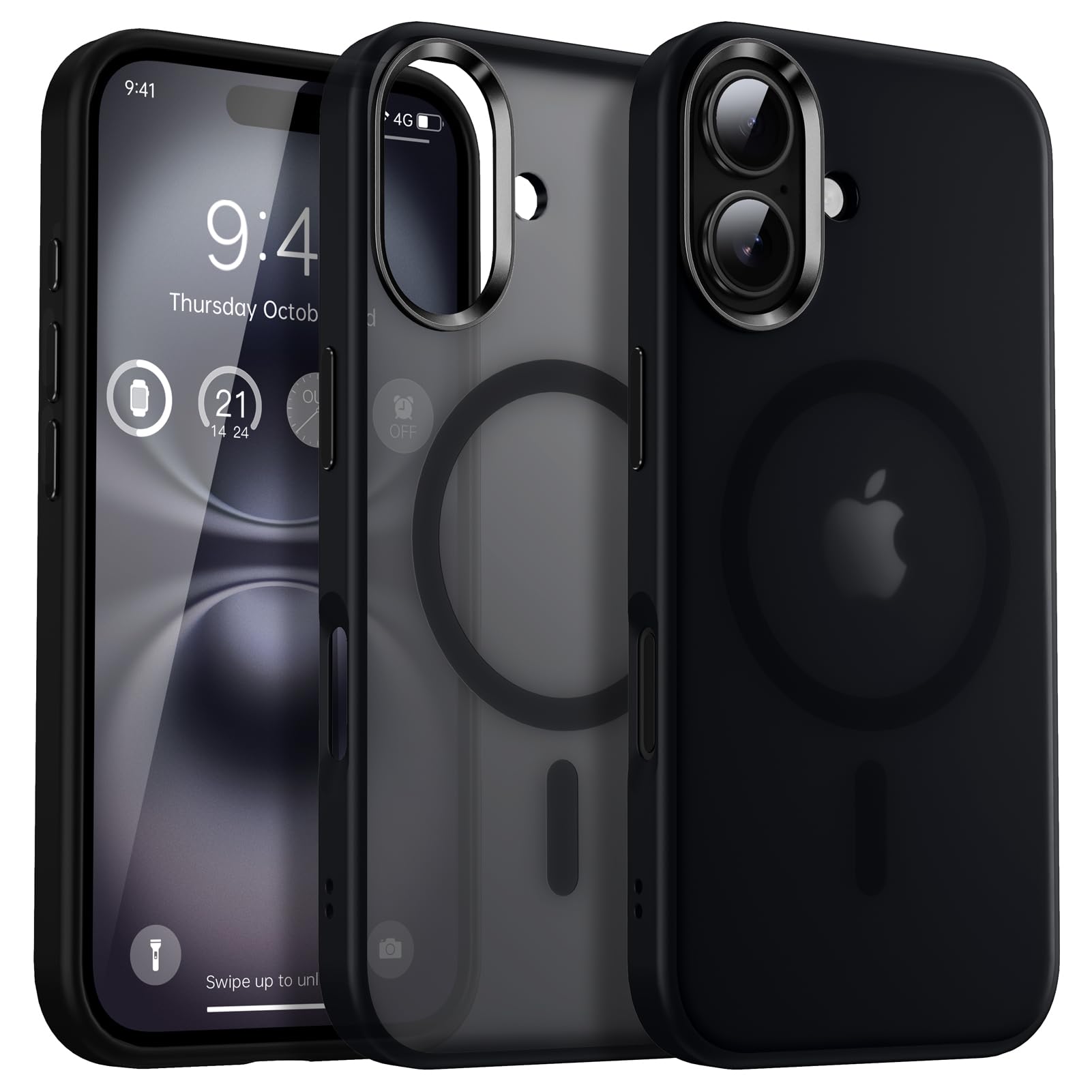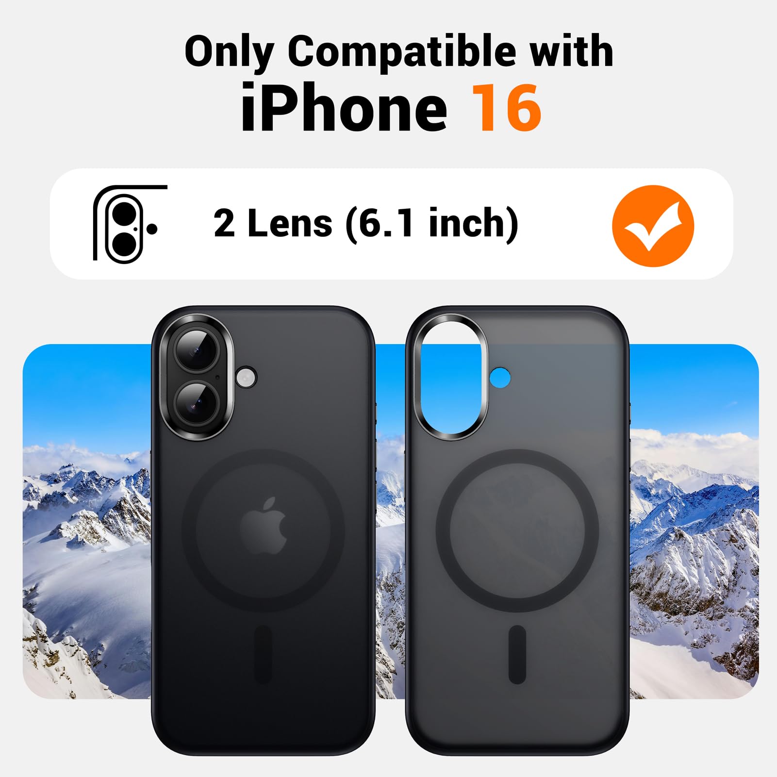【在庫処分】Flyzoo用のiPhone 16磁気ット式マットケース MagSafe対応 米軍MIL規格 耐衝撃 ワイヤレス充電 指紋防止 耐黄変 擦り傷防止 薄型で半透明の超軽量シリコーン電話カバー マグネットスマホケース 6.1インチ、ブラック