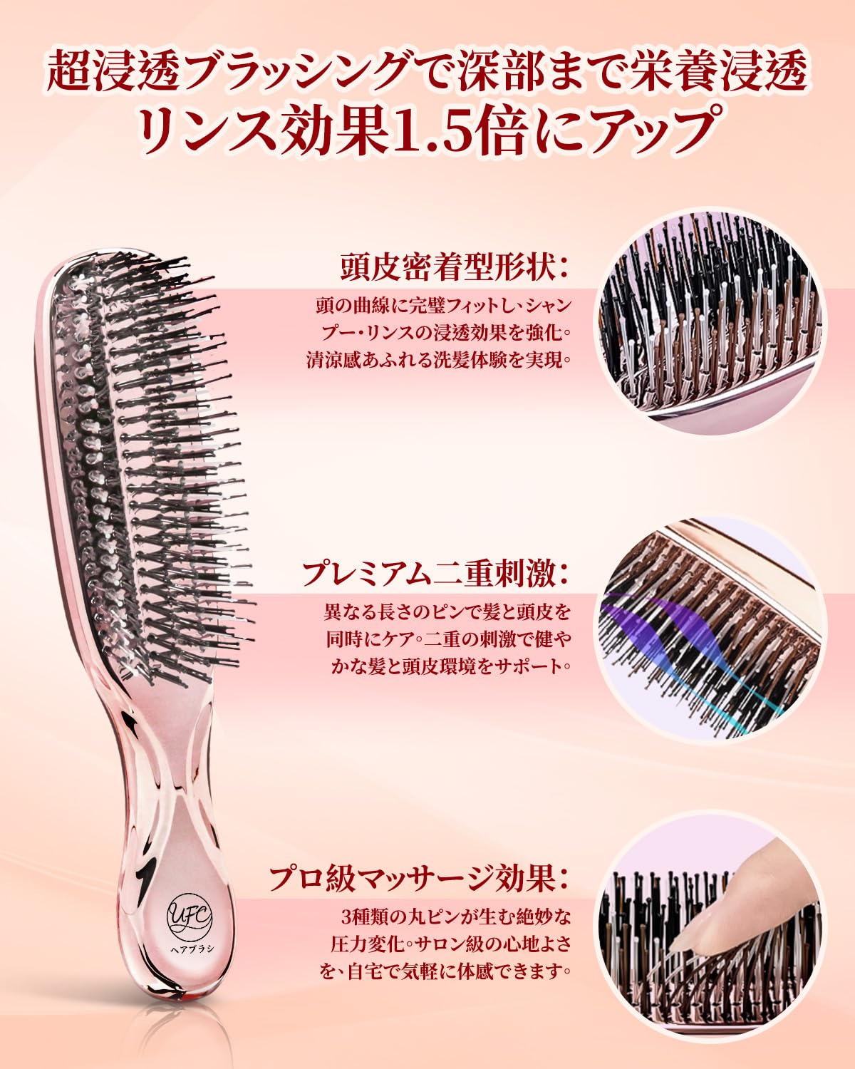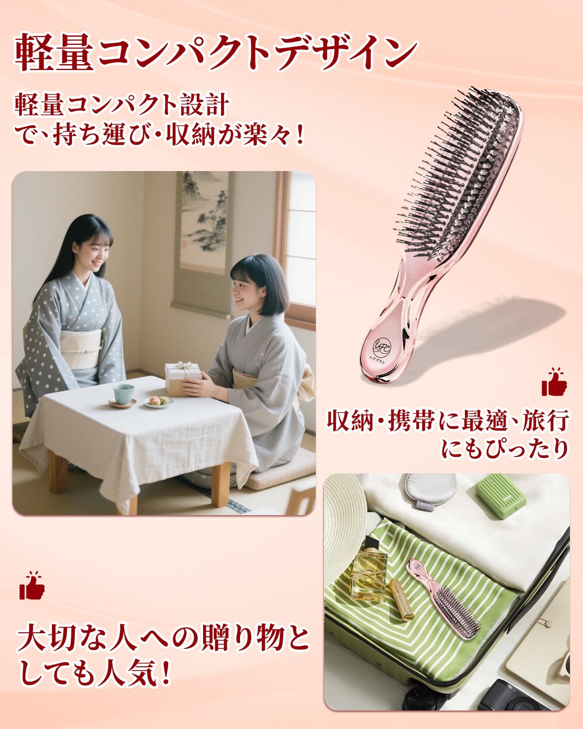 「ドライもウェットも快適に使える万能仕様」お風呂場でのシャンプー中はもちろん、タオルドライ後の濡れ髪にも対応しており、朝のスタイリング時にはブローブラシとして活躍し、髪に自然な流れとボリュームを与えてくれます。湿度の高い季節や乾燥が厳しい冬場でも、静電気が起きにくい設計のため、季節を問わず一年中使いやすいのも大きな魅力です。