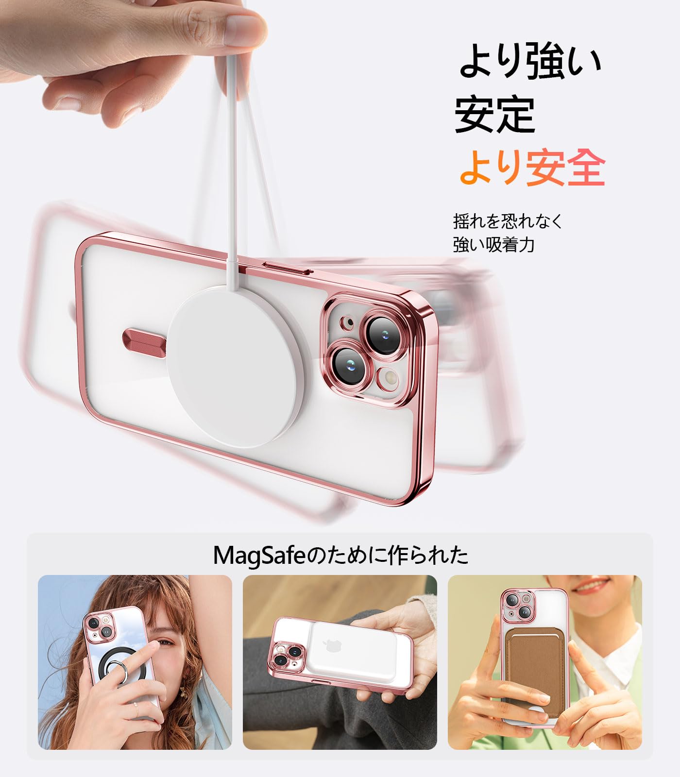 【MagSafeに対応・強磁力】このiphone 15 plus ケース magsafeを使用することで、より高速かつ便利なワイヤレス充電を体験できます。38個のN52磁石が内蔵されており、通常の磁気ケースよりも磁力が10倍強力です。自動的にMagSafe充電器に合わせることができ、ケースを外さずに本来の充電スピードを体験できます。すべてのMagSafeアクセサリに対応できます。