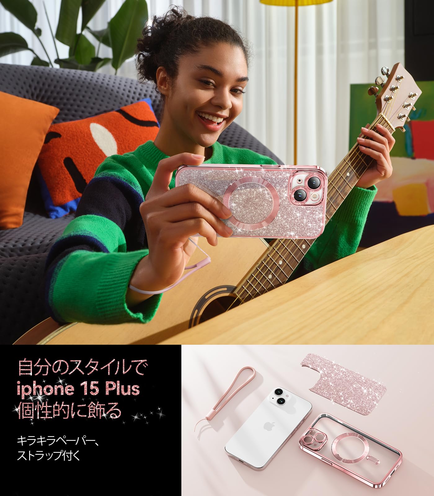 【ストラップ・キラキラ紙】【***注:厚いレンズフィルムを使用しないでください。レンズフィルムを使うとカメラ部分が浮いているかもしれません。】電気メッキ技術により、ケースは輝く色を持ち、色褪せることや剥がれることはありません。ストラップが付き、より簡単に携帯できます。ケースと色が一致するキラキラペーパーも付き、iphone 15plusをより輝かせます。