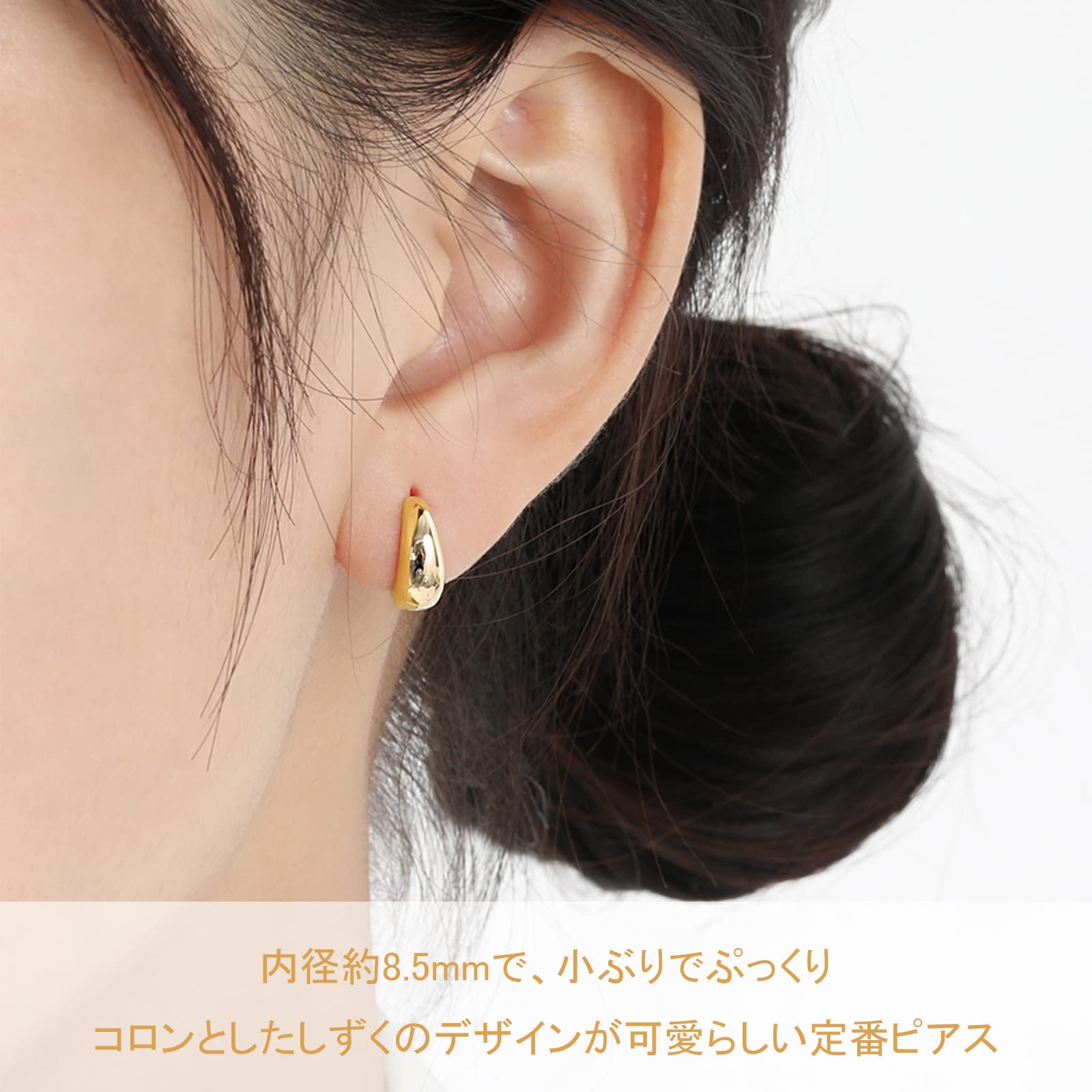 【小ぶりながらぷっくりコロンとしたしずくのデザインが可愛らしい定番ピアス】内径約8.5mmで、小ぶりながらぷっくりコロンとしたしずくのデザインがとても上品で可愛らしく、数多くのお客様に愛されてきた定番ピアスです。シンプルを極めた、洗練されたデザインはとっても使い勝手が良く、幅広い年齢層のお客様にご愛用頂けます。外径約12.3mmで、フープの線幅約5.2mmと程よいボリュームがあって可愛らしいですが、とても軽やかで一日中着けていても快適です。ポストは小さなピアスホールの方も痛くならないよう、直径約0.8mm(20G)となっています。地金は体に優しく幸運を運んでくれるスターリングシルバー925を使用し、高級感溢れる18金コーティングが熟練の職人たちの手によって丁寧に施されています。エレガントで大人可愛いピンクゴールドと、ゴージャスで肌映えの良いゴールド、そしてスタイリッシュで上品なプラチナの3色がラインナップされています。本物ならではの上品な輝きはさり気なく耳元を彩ってくれます♪