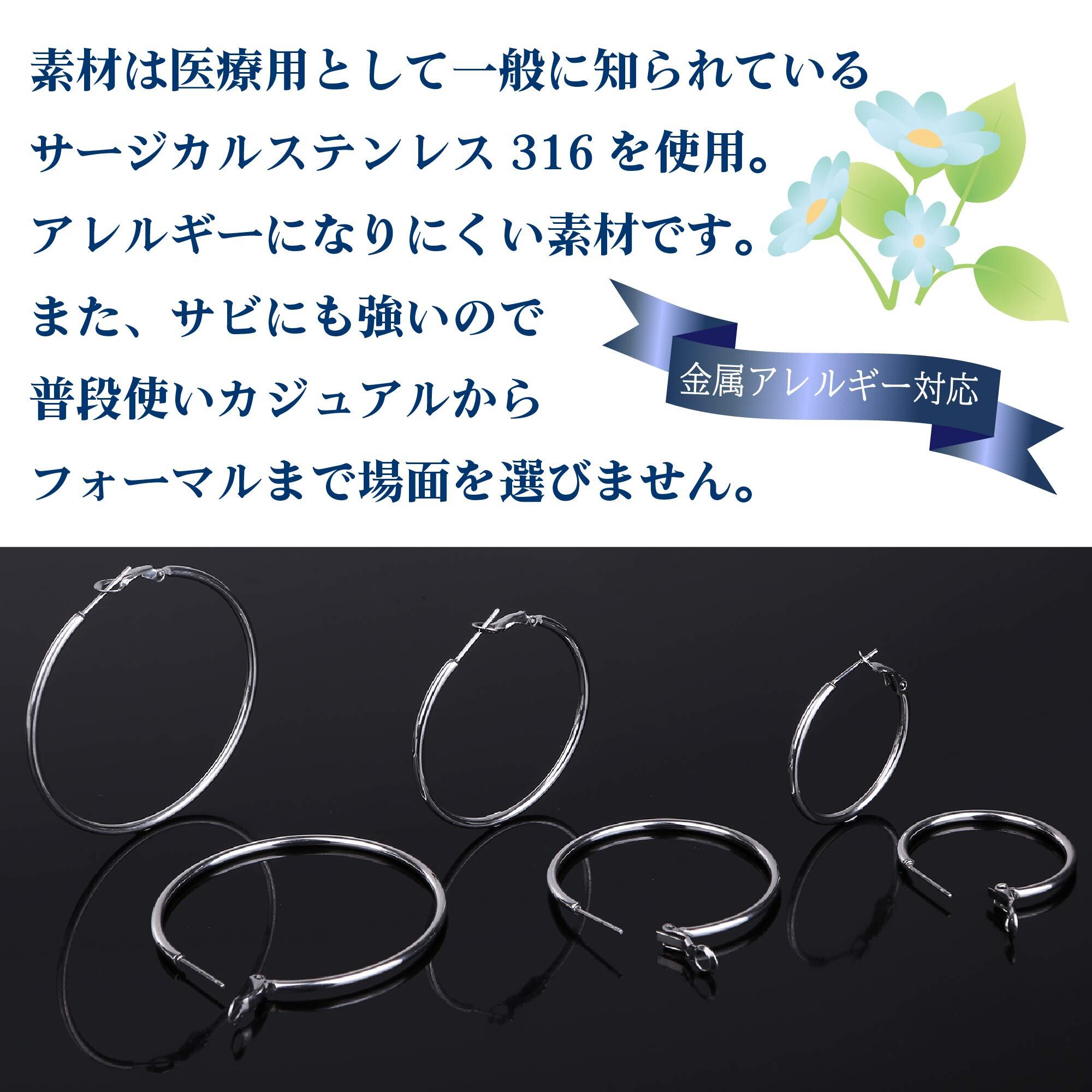 ?【豊富なサイズ展開でぴったりのフープピアスが見つかる】サイズは30mm・40mm・50mm・60mm・70mmと大きめサイズを中心に幅広く展開しています。ステンレスのまばゆい輝きが顔周りを明るく華やかに演出しどんなスタイルにもマッチします。シンプルでありながら存在感のあるデザインが特徴でカジュアルからフォーマルまでさまざまなシーンで活躍。さらに、軽量設計により耳に負担が少なくつけっぱなしでも快適にお使いいただけます。