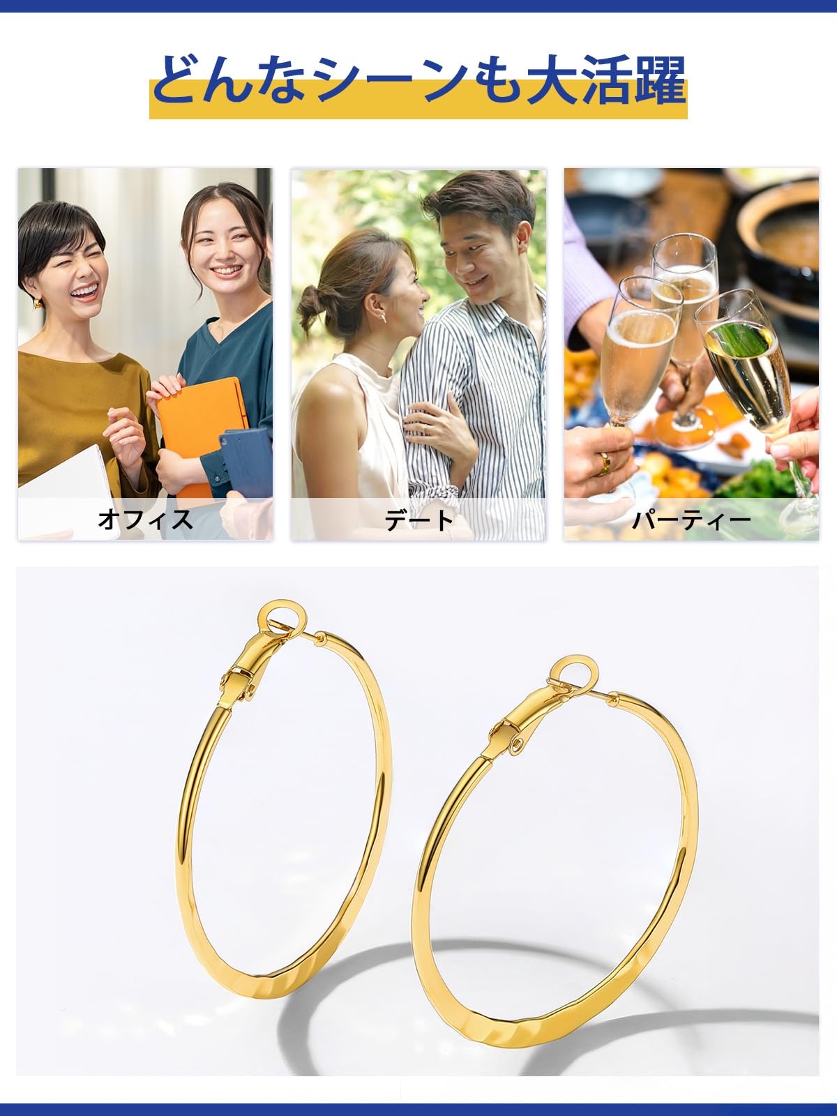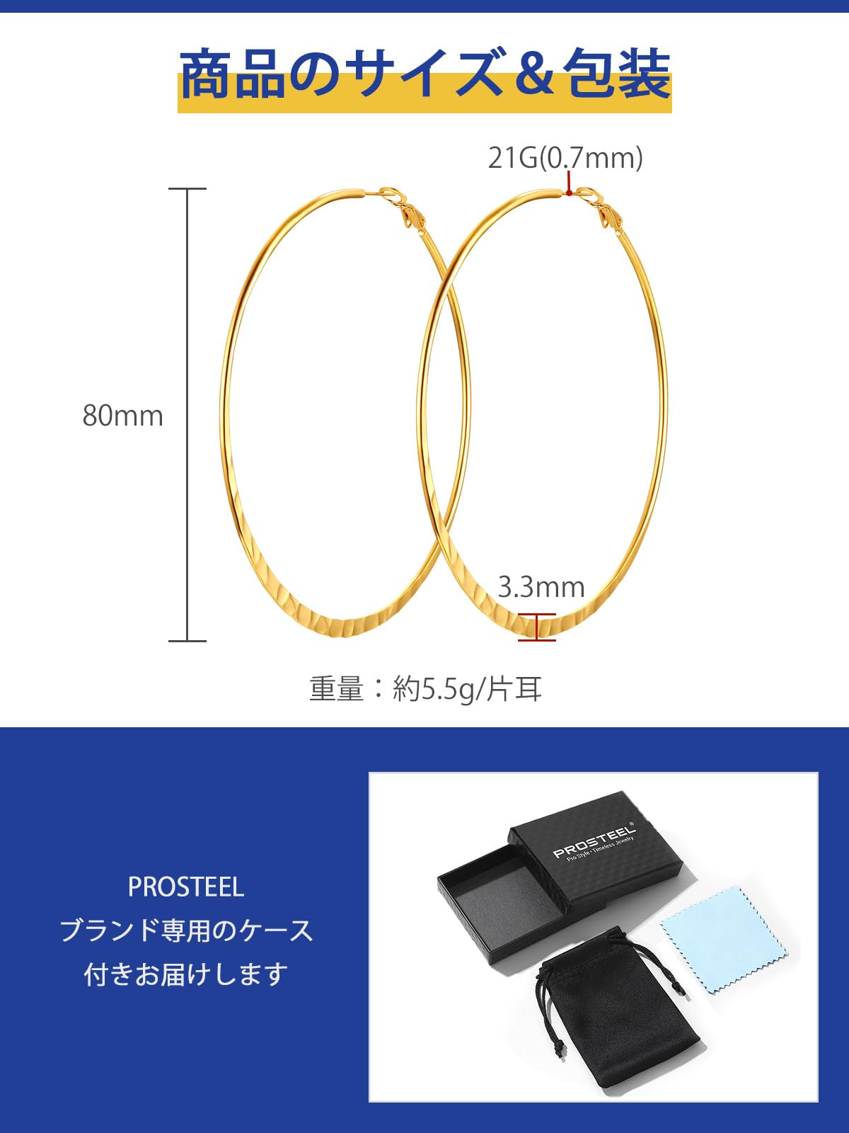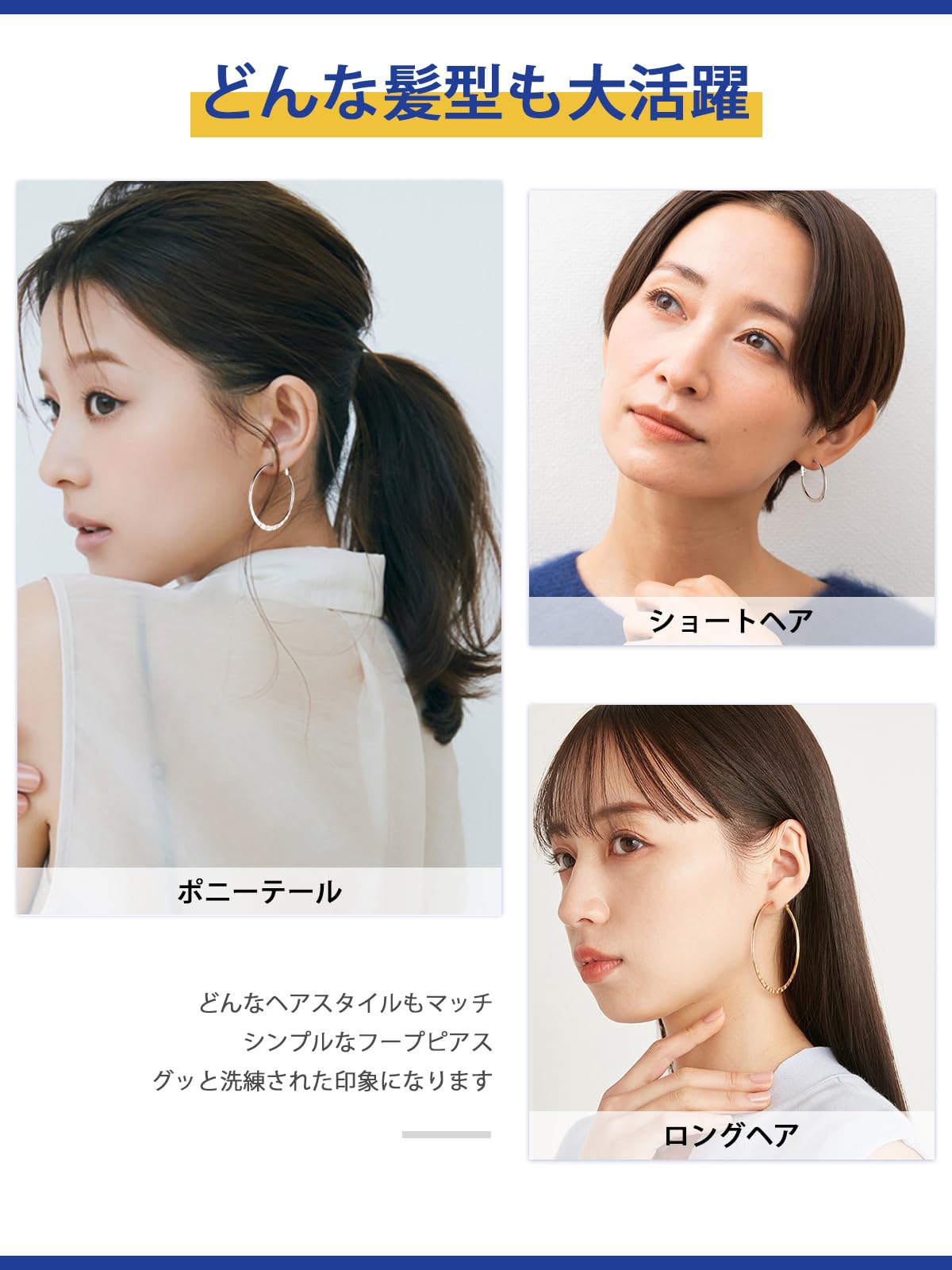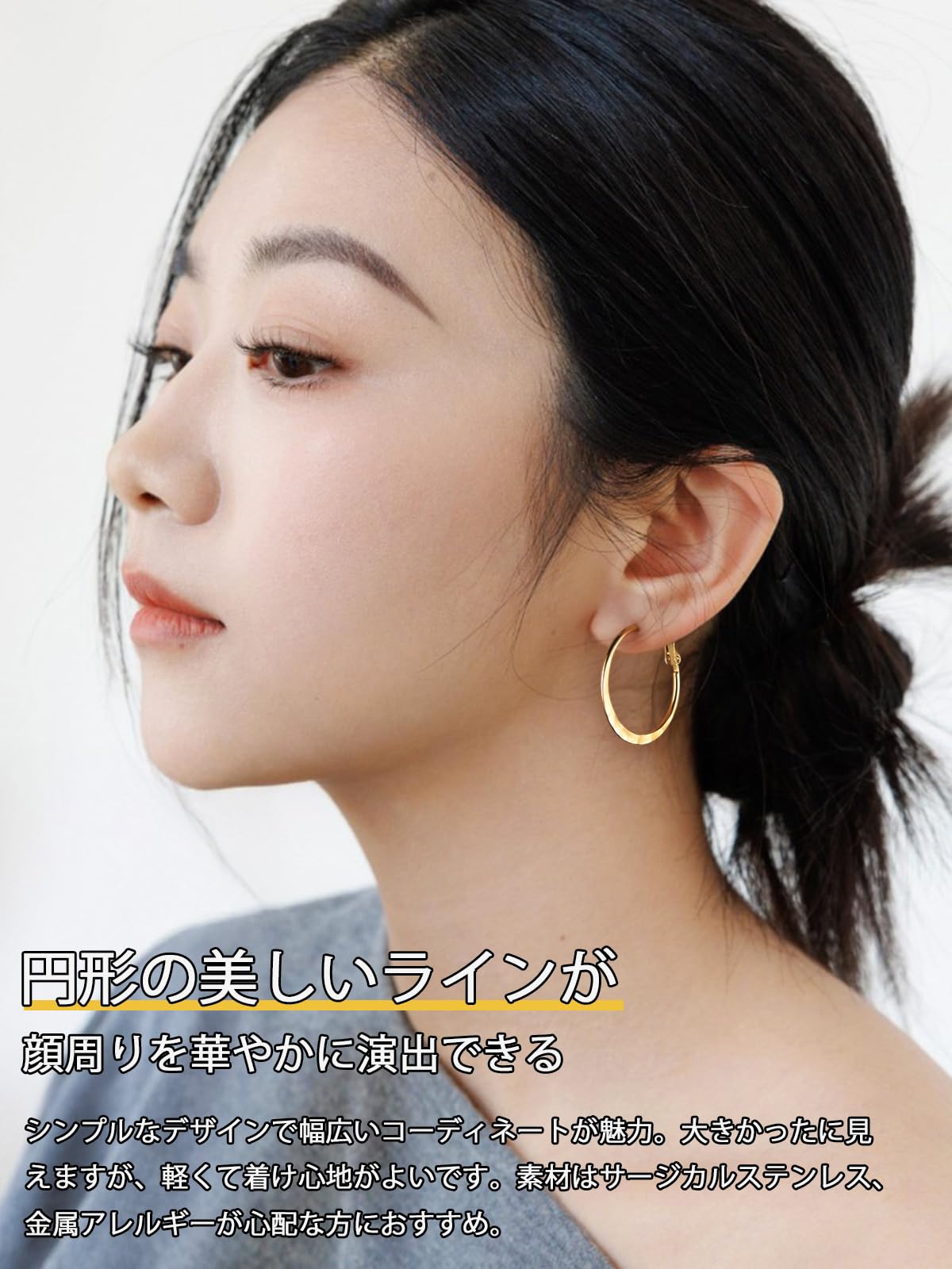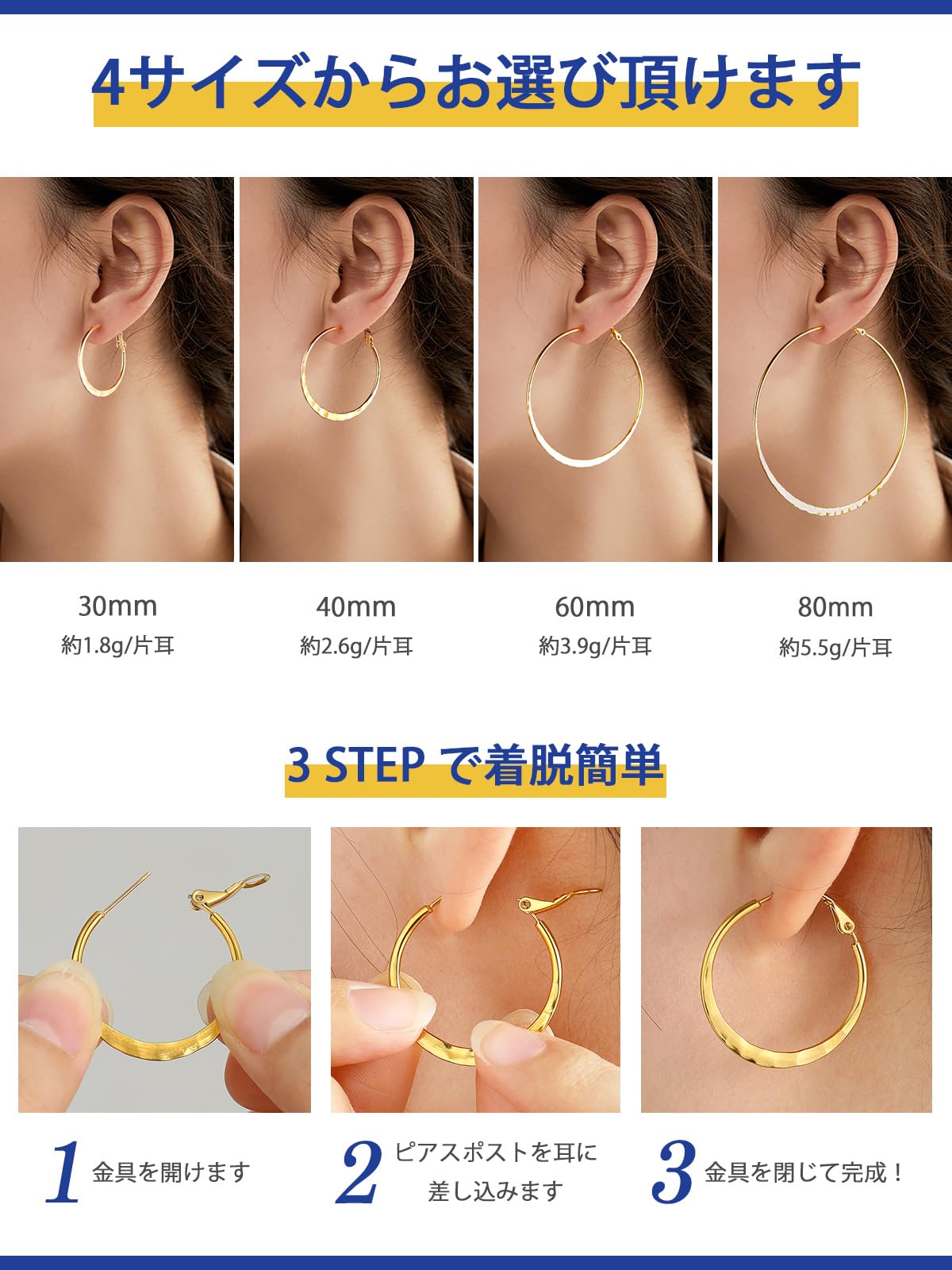 【サイズによって印象が変わる】30mmのフープピアス:初心者におすすめ;40mmのフープピアス:フィスでも上品に映えるサイズ;60mmのフープピアス:小顔効果を狙う方におすすめ;80mmのフープピアス:インパクト大!オシャレを楽しみたいオフの日につけましょう。