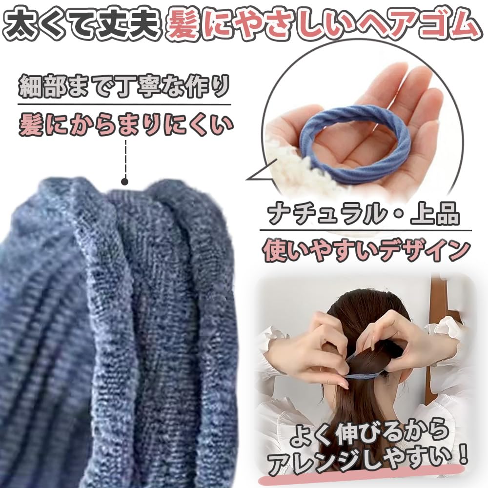 【髪にやさしい太め設計】 太くて丈夫なラバー素材を使用し、切れ毛・抜け毛を防止。髪や頭皮への負担が少なく、やさしいつけ心地です。