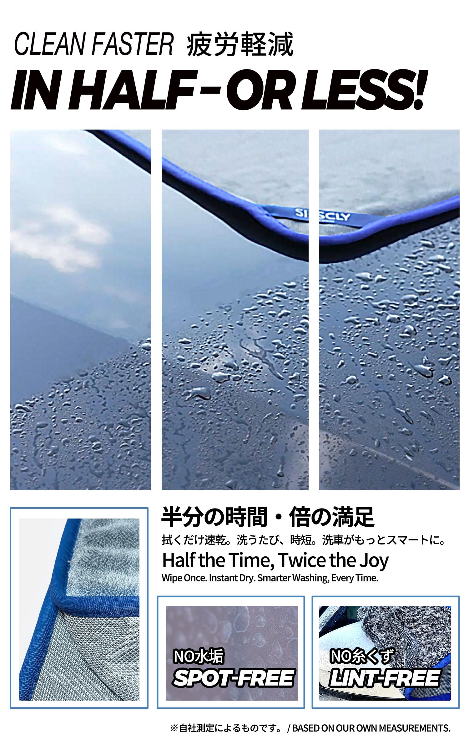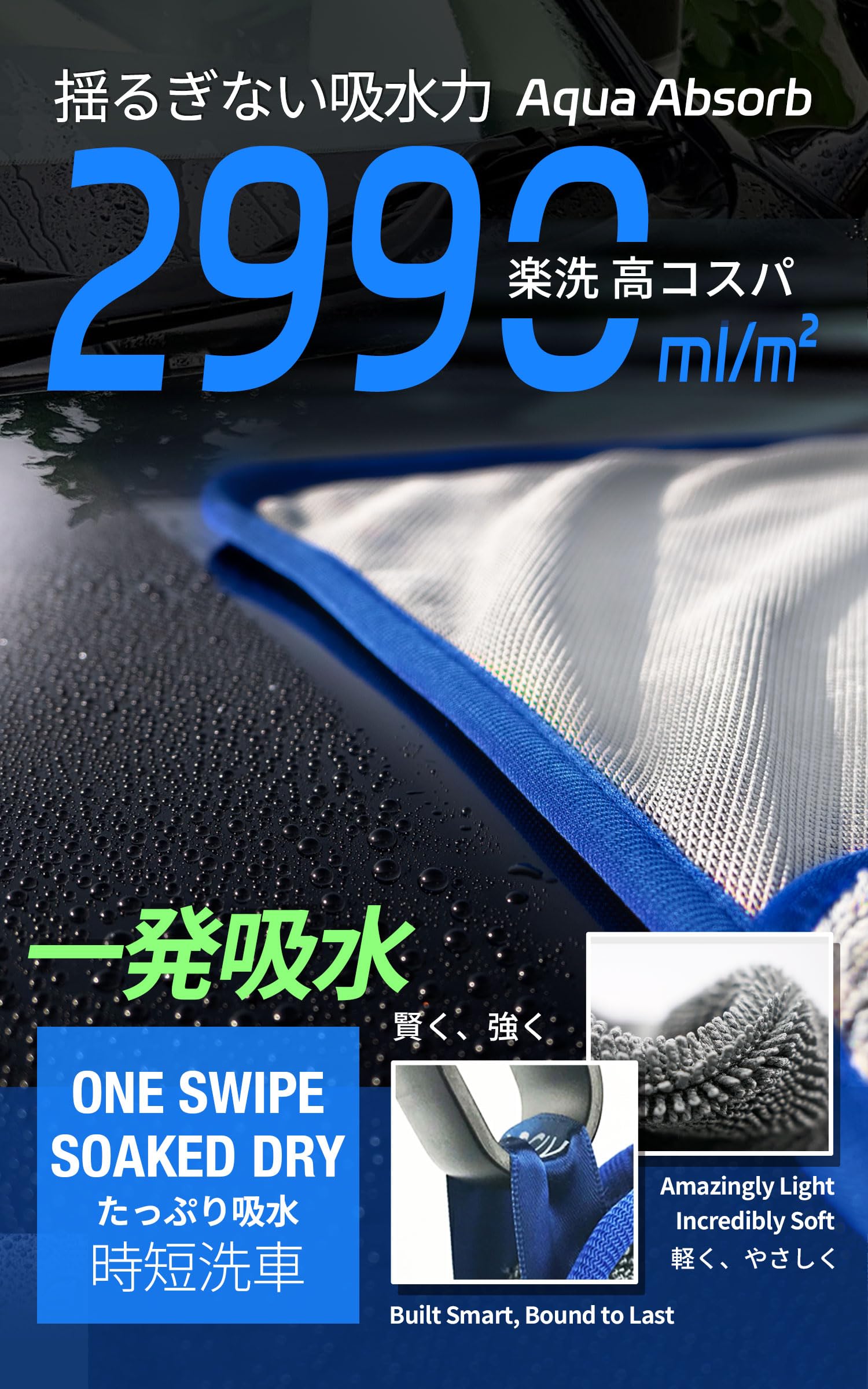 【仕様】サイズ50x60cmで、ロングツイストマイクロファイバーで織り上げられたタオルです。細かい繊維が水分をスムーズに吸収します。軽く引っ張って投げかけるだけで、車体、ガラス、プラスチックなどの表面の水分を瞬時に拭き取り、素早く乾かすことができます