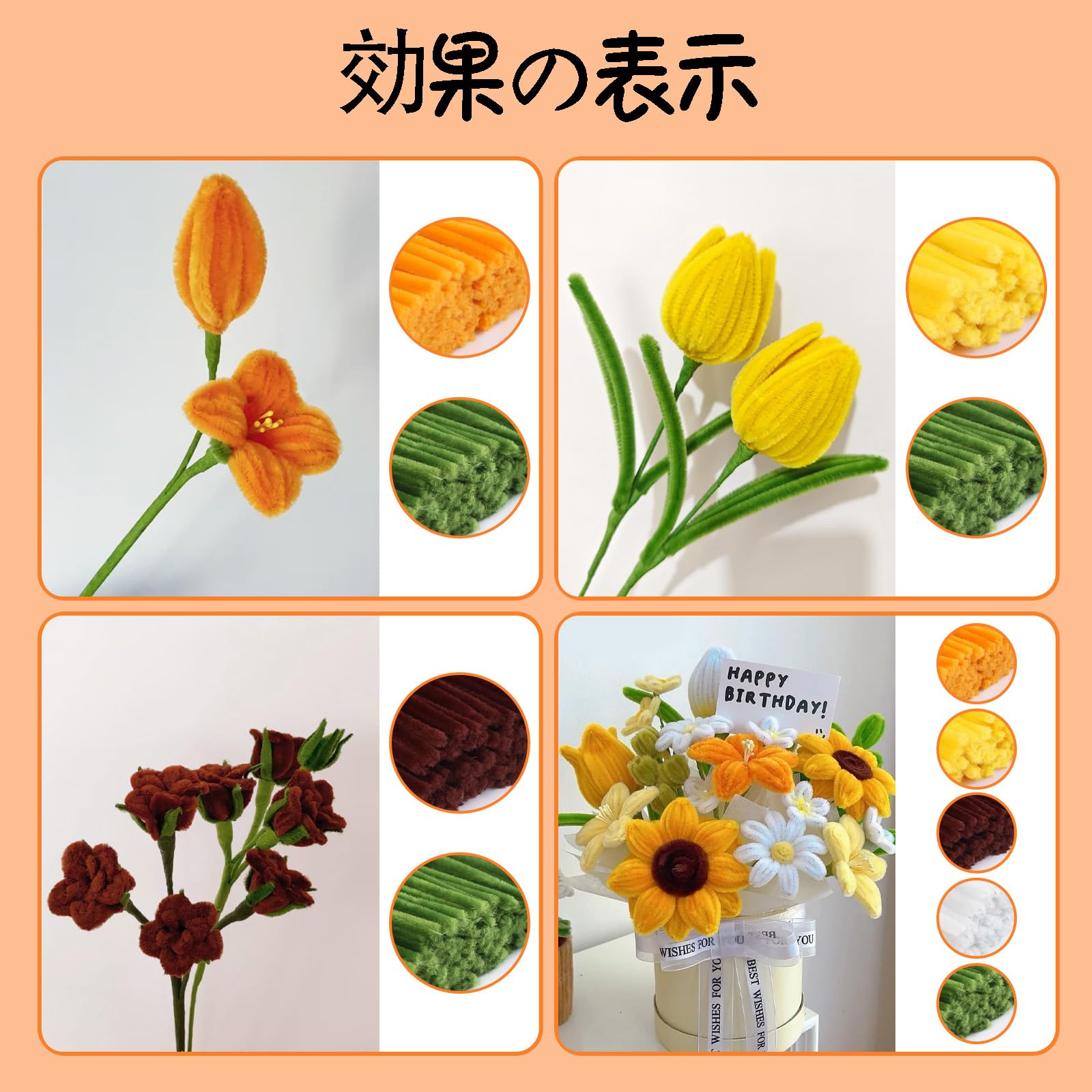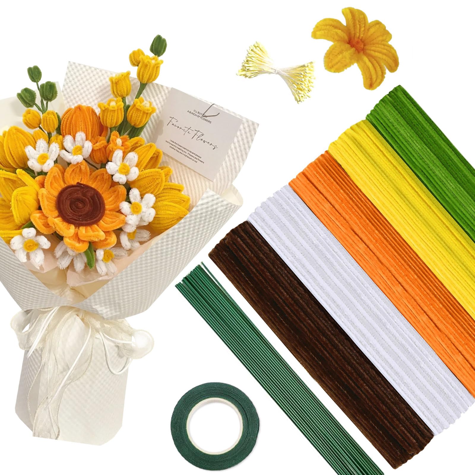 【在庫のみ】手芸モール 250本 カラーミックス フラワーモール 手作りキット 6mm 花束 モールフラワー キット クラフトモール 工作モール 人工花茎20本フラワーテープ緑1巻 双頭花おしべ DIY 飾り物 造形材料 学校 手作り素材 手芸 用品 記念日 誕生日 母の日 バレンタインデー 贈り物 (黄色)