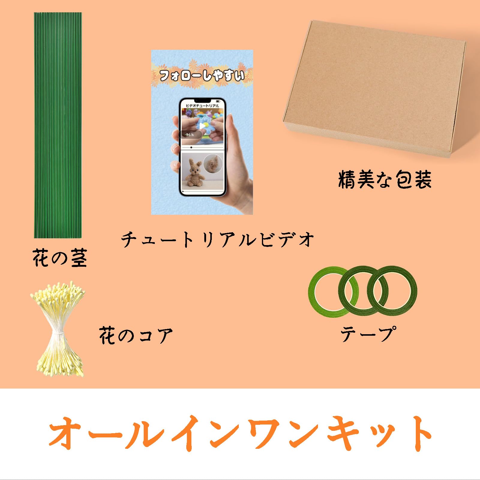 【商品仕様】モール*約250本(6mm*30cm),ビニルコーティングワイヤー*20本(2mm*30cm),フローラテープ 1巻(長さ約27m*幅12mm),双頭花おしべ*約150本。