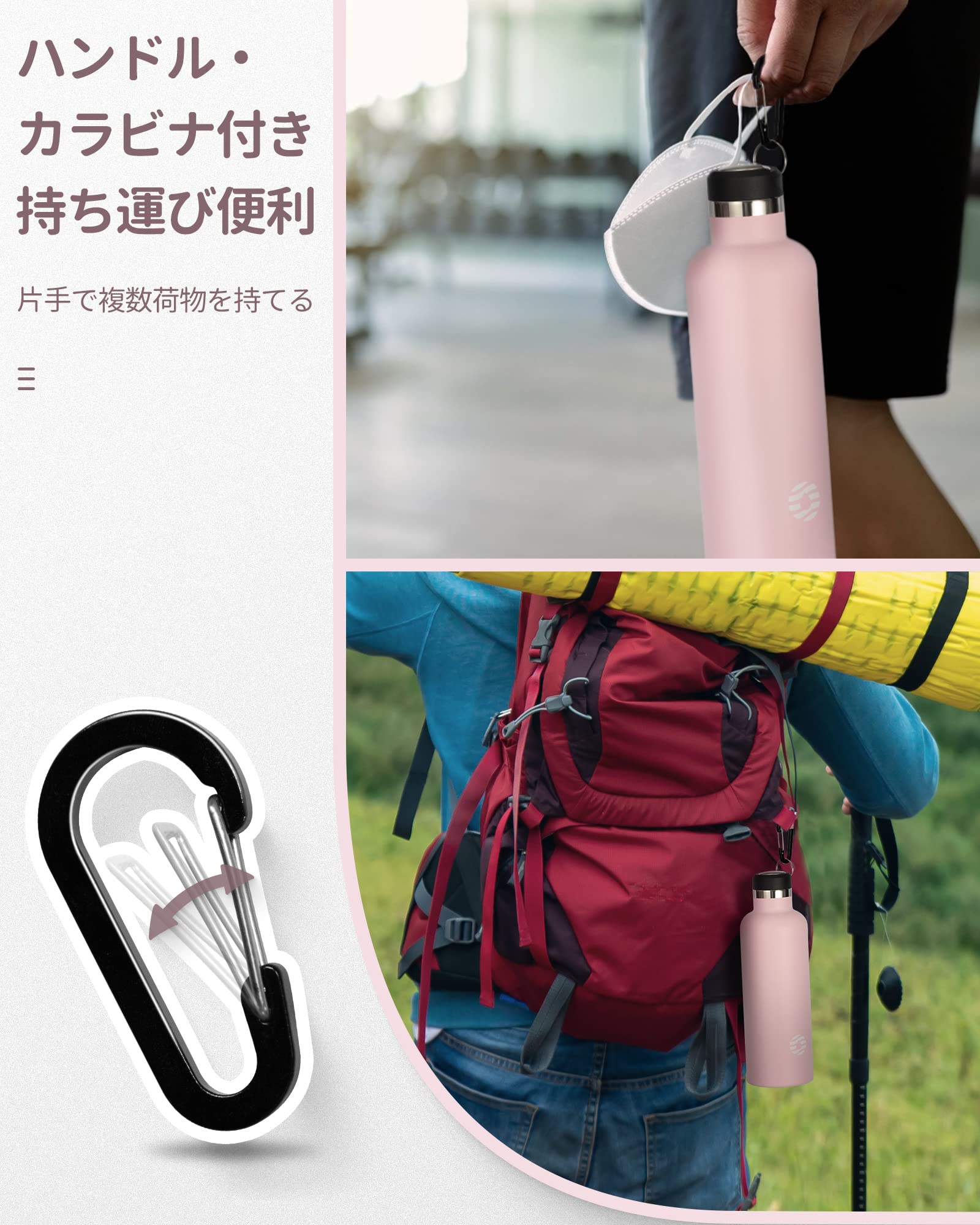 【広口・大容量】口径:4.5cm、容量:500ml/600ml/750ml/1000ml。アウトドアにはもちろん、室内での水分補給もしっかりとれます。持ち運びに便利なカラビナ付きなのでオフィス・学校用の水筒や部活、スポーツ、外での営業仕事や移動が多い方にもおすすめです。