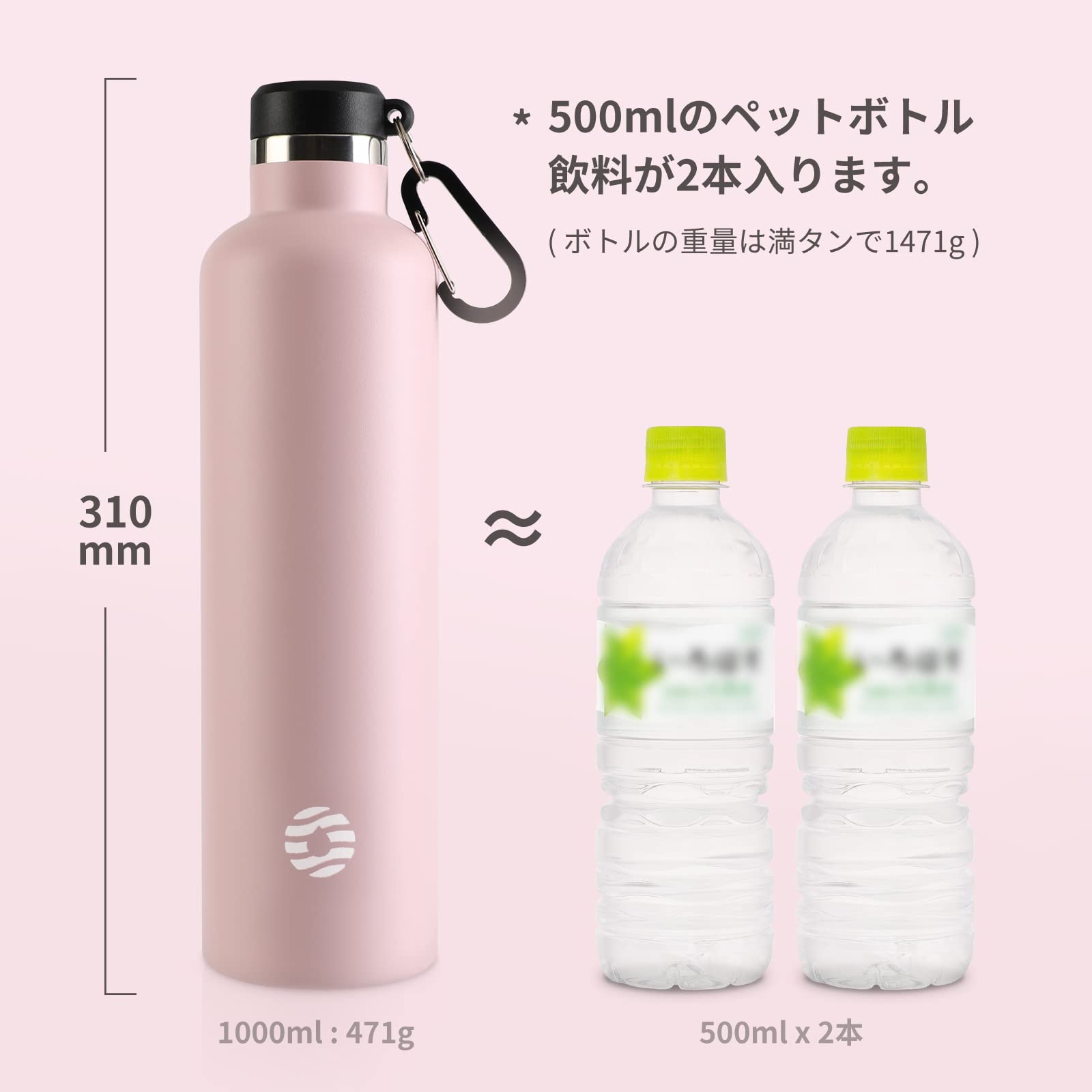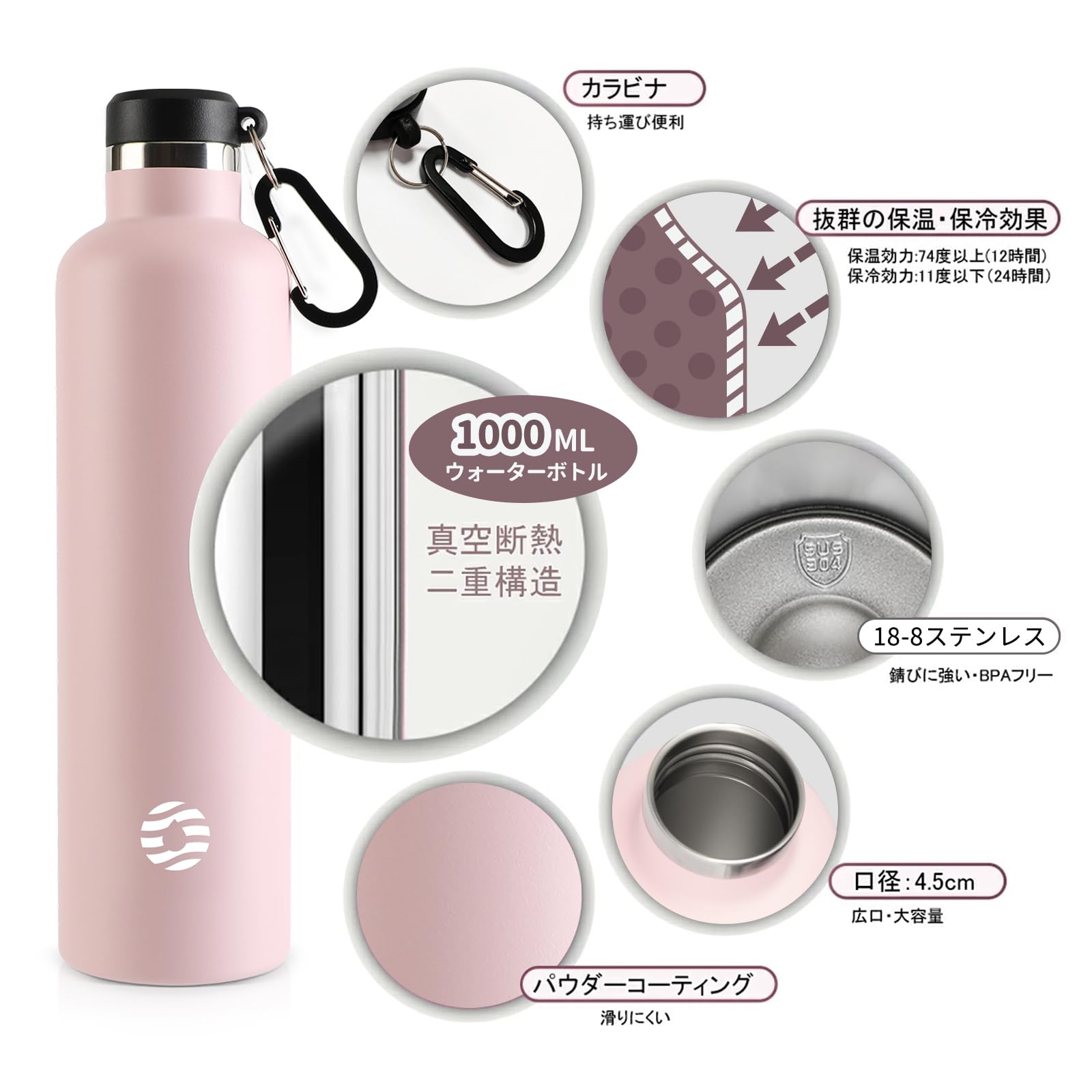 【広口・大容量】口径:4.5cm、容量:500ml/600ml/750ml/1000ml。アウトドアにはもちろん、室内での水分補給もしっかりとれます。持ち運びに便利なカラビナ付きなのでオフィス・学校用の水筒や部活、スポーツ、外での営業仕事や移動が多い方にもおすすめです。