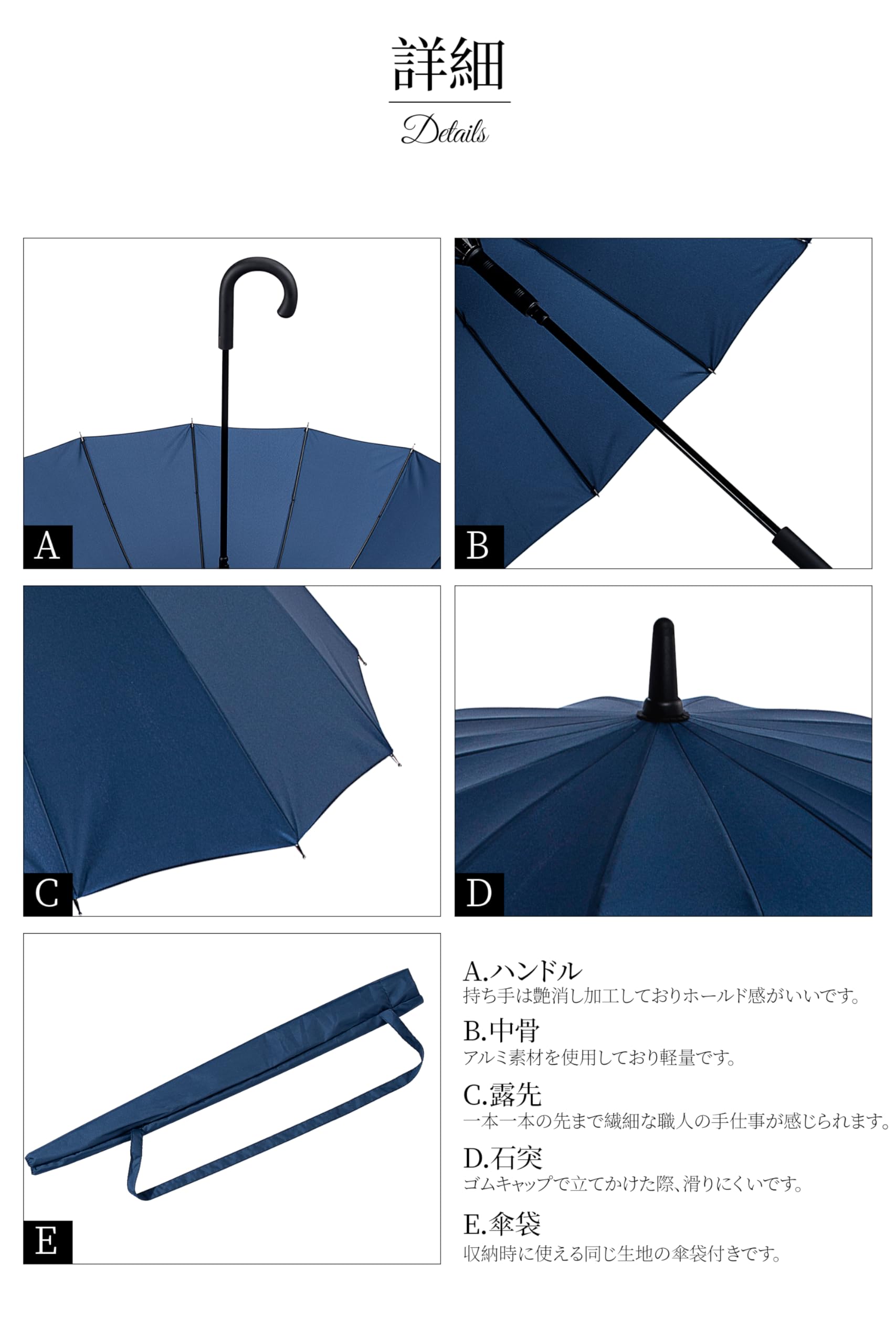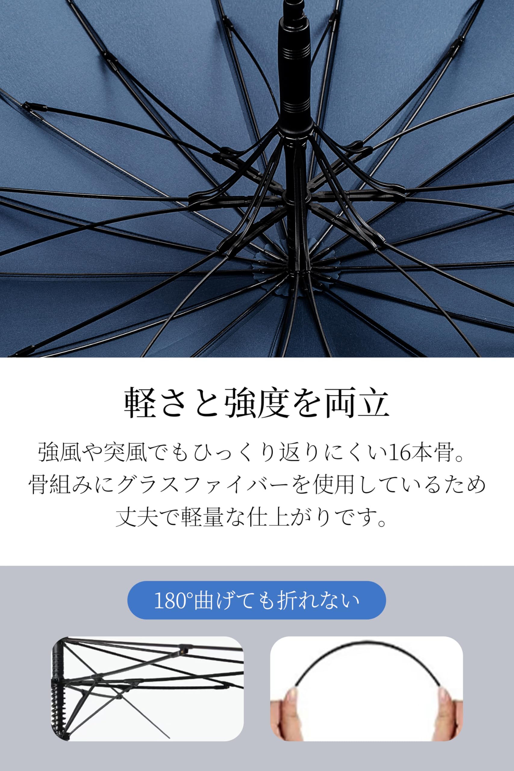 【強風でも安心の16本骨】強風や突風でもひっくり返りにくい16本骨。親骨にカーボンを使用しているため丈夫で軽量な仕上がりです。