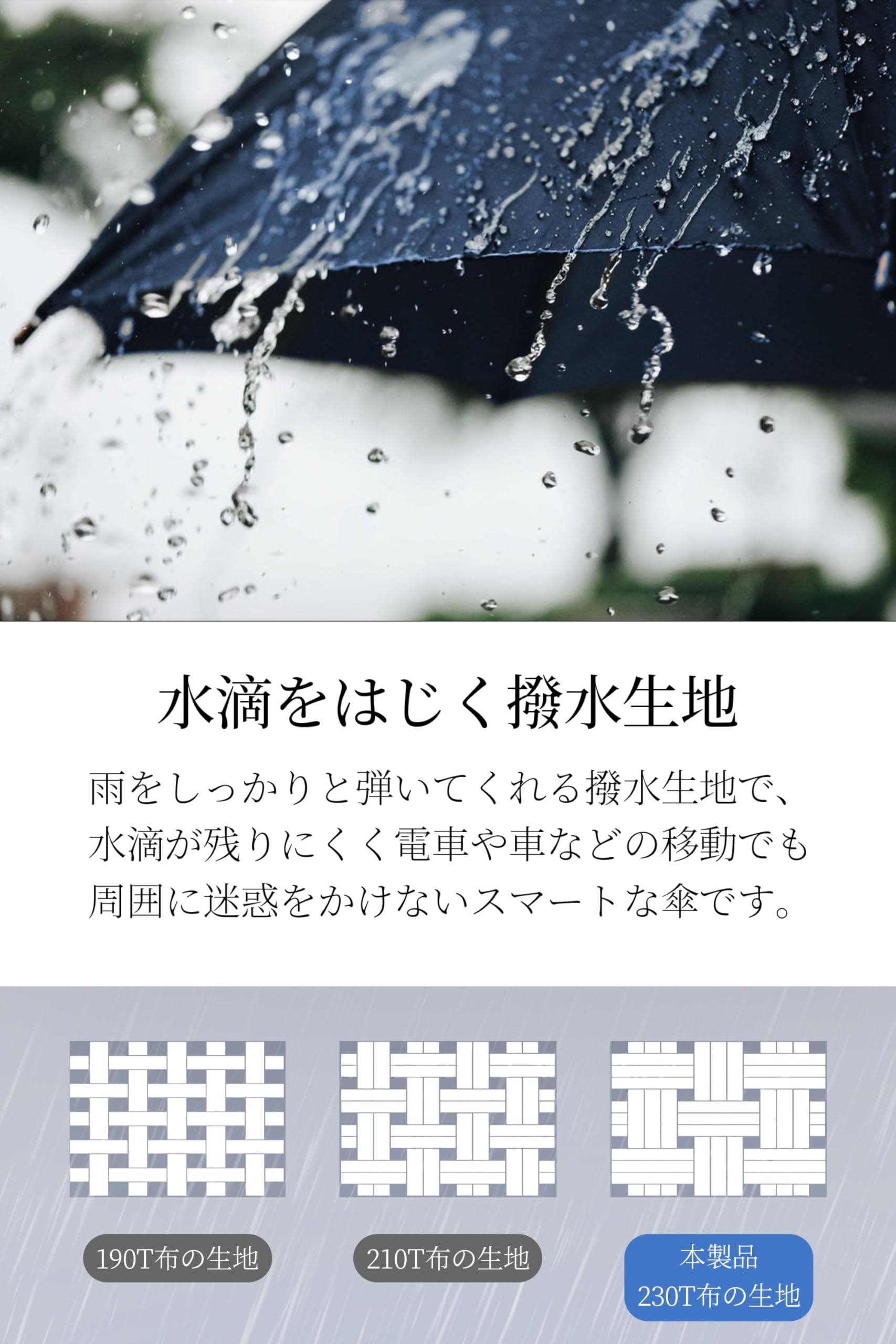 【日傘としても使える晴雨兼用傘】超撥水生地を使用。数回振るだけで瞬時に乾燥します。強力な撥水性と同時に、生地の織り方だけで遮光遮熱99.99%を実現。真夏の日傘としてもお使いいただけます。