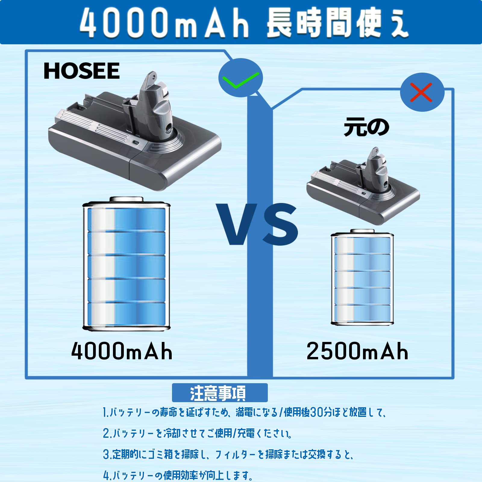 【長時間使え】容量:4000mAh 電圧:21.6Vのバッテリー付き、ブールフル充電の状態で約20分〜30分の使用ができ、十分の連続稼働時間を提供します。純正バッテリーに比べて同じ作業効率が確保うえ、長くお使い頂くことが出来て家事の負担が軽減されます。