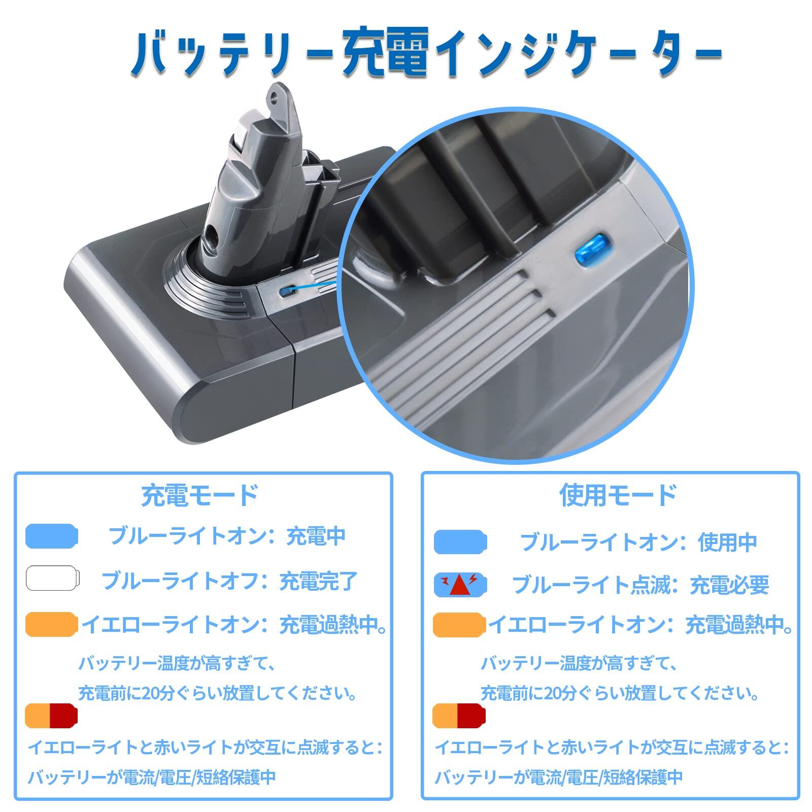【バッテリー充電インジケーター】本製品は充電や、取り外すことがもっと便利、安全になります。青いランプが点灯する:充電中。青いランプが消える:充電完了。イエローランプが点滅する:充電過熱中。バッテリー温度が高すぎて、充電前に20分ぐらい放置してください。イエローライトと赤いライトが交互に点滅すると:バッテリーが電流/電圧/短絡保護中。もし電池異常がある場合、販売者にご連絡ください。