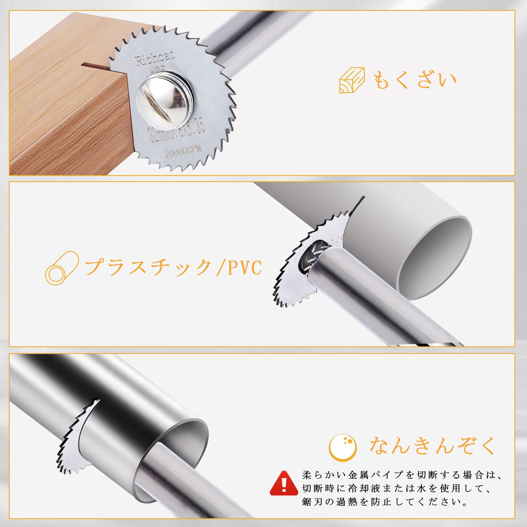 【パッケージ内容】パイプカッターセット、6つの鋸刃(直径0.87インチ(22MM)の鋸刃1個、直径1インチ(25MM)の鋸刃1個、直径1.25インチ(32MM)の鋸刃1個、直径1.38インチ(35MM)の鋸刃1個と直径1.75インチ(44MM)の刃1個と直径1.97インチ(50MM)の刃1個)と1セットのネジ締結具を備えている。鋸刃を保護ために、鋸の刃には保護油が積まれて、気にしないで。Webページには使用動画があります。