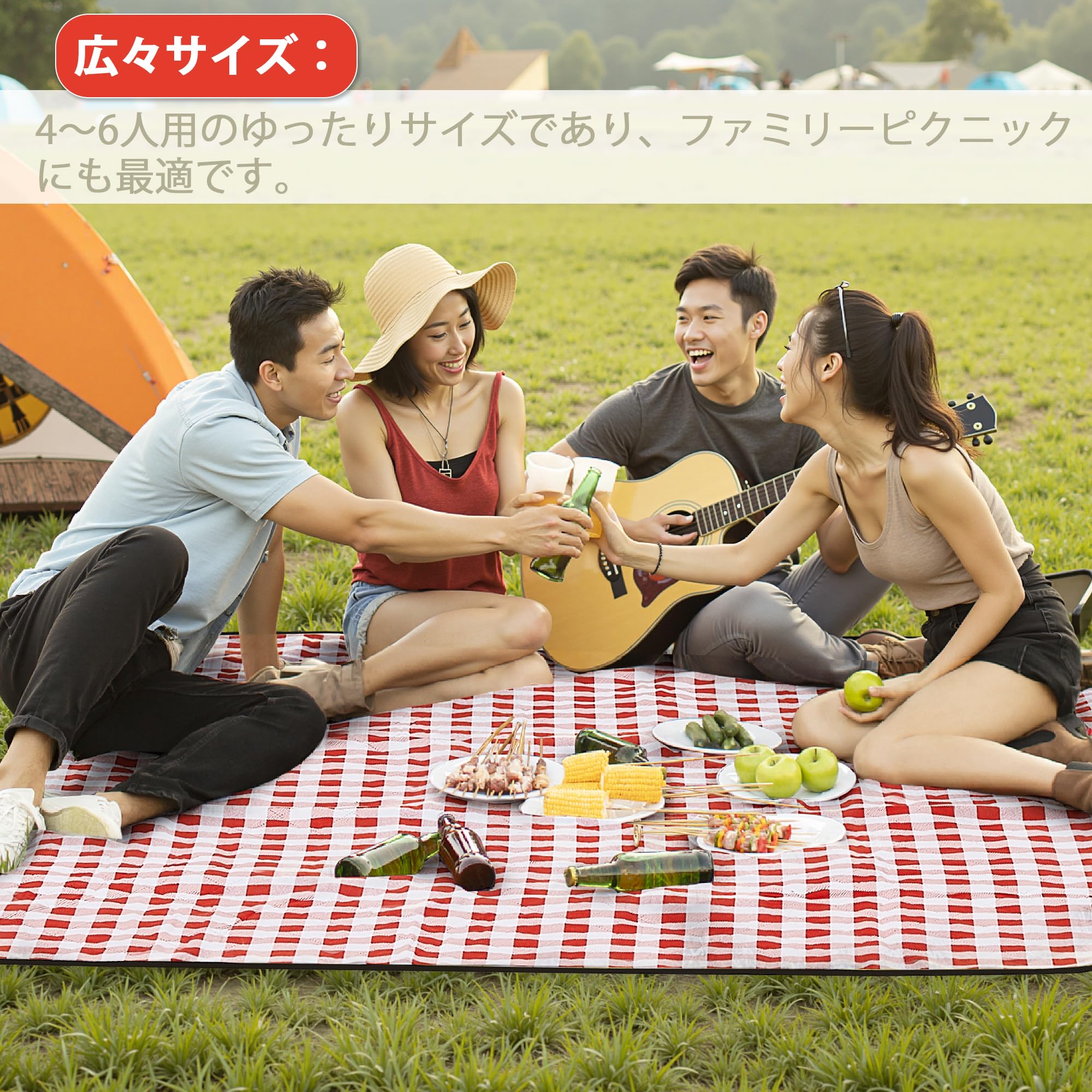 【広いサイズで快適な空間】本社のキャンプマットはサイズの大判デザインで、家族や友人と一緒にゆったりくつろげる広々としたスペースを提供します。ビーチマットとして、シンプルかつおしゃれなデザインで、さまざまなシーンにマッチします。アウトドアだけでなく、室内や庭での使用にも適しています。