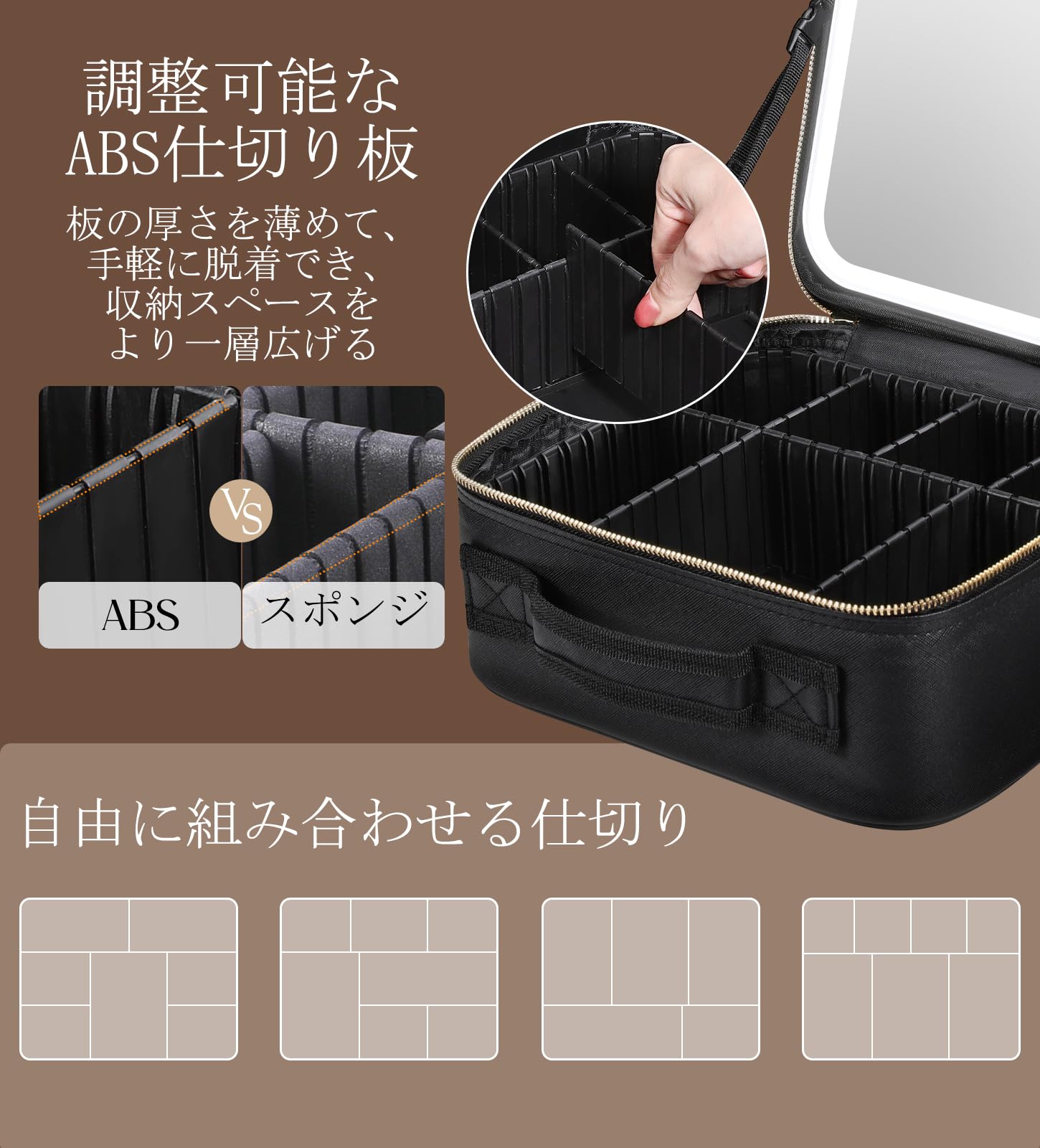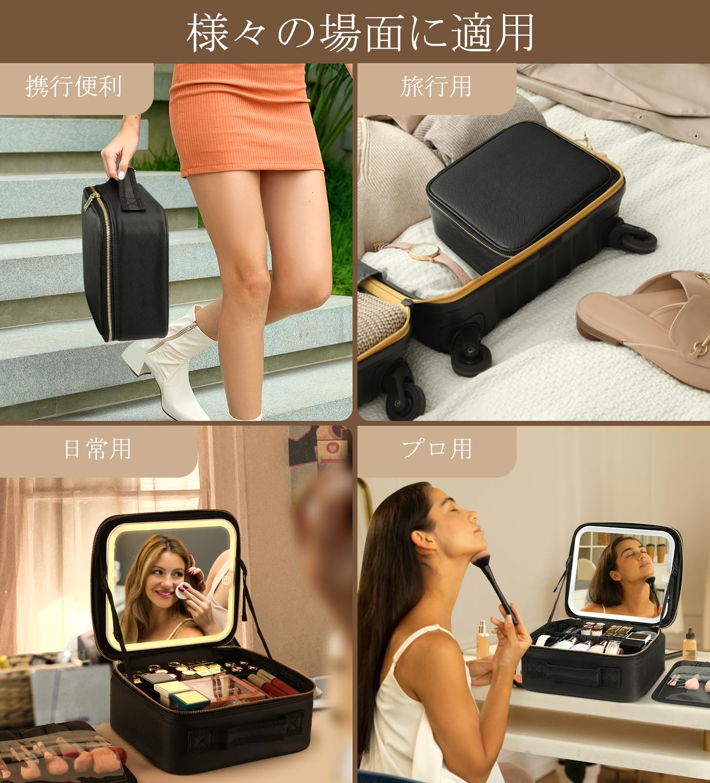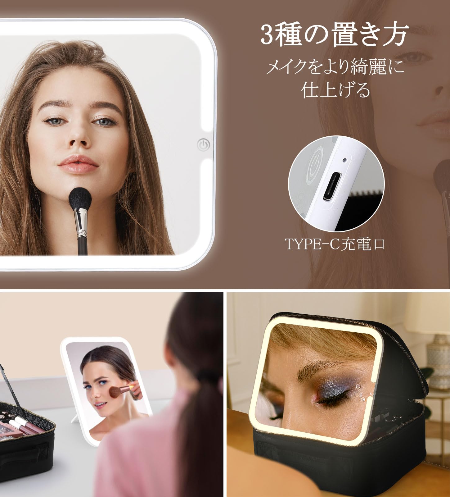 「LEDライト鏡付き」 昼白色・温白色・電球色の3色に切り替えられるLEDライト付き鏡が内蔵され、ボタンを長押しすれば無段階調光できます。USB充電式で在宅、オフィス、車内、外出時などの時にも簡単に充電できます。マジックテープ式固定で、鏡をメイクボックスから外すことは可能です。
