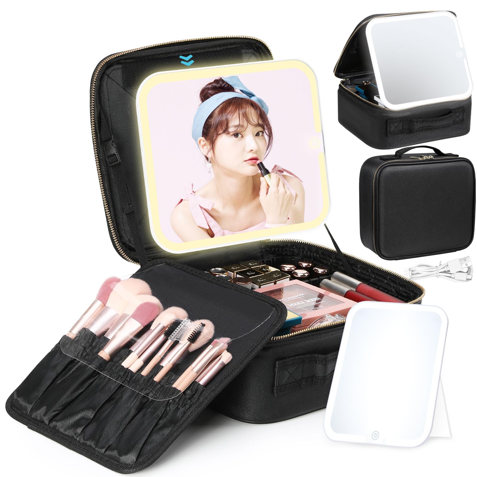 Luxspire メイクボックス コスメボックス メイクブラシバッグ LEDライト付き鏡 3色ライト 無段階調光 EVA化粧ポーチ コスメポーチ メイクポーチ 手提げ式 サイズ:26*23*11CMプロ用 仕切り 小型 防塵 仕切り調整可能 通勤・出張・旅行用 機能的收納 大容量 衝撃吸収 化粧品収納 収納ケース 母の日 ブラック