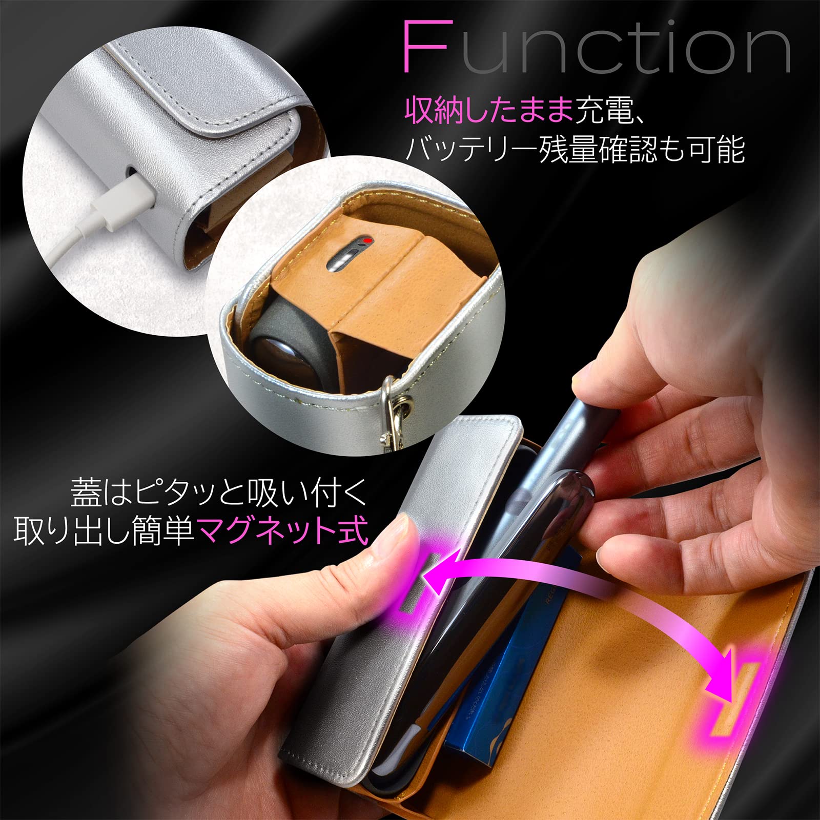 この商品は、オールインワンのケースです。 本体とヒートスティックをまとめて収納出来ます。 ケースに収納したまま充電する事ができ、充電ランプも確認できます。 【素材】PUレザー 【重さ】45g