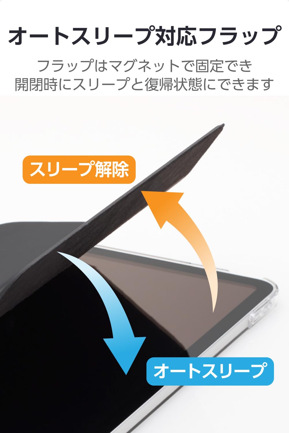■不使用時に画面部分を保護するフラップが付いています。フラップを閉じるとスリープモードになり、開けるとスリープから復帰します。