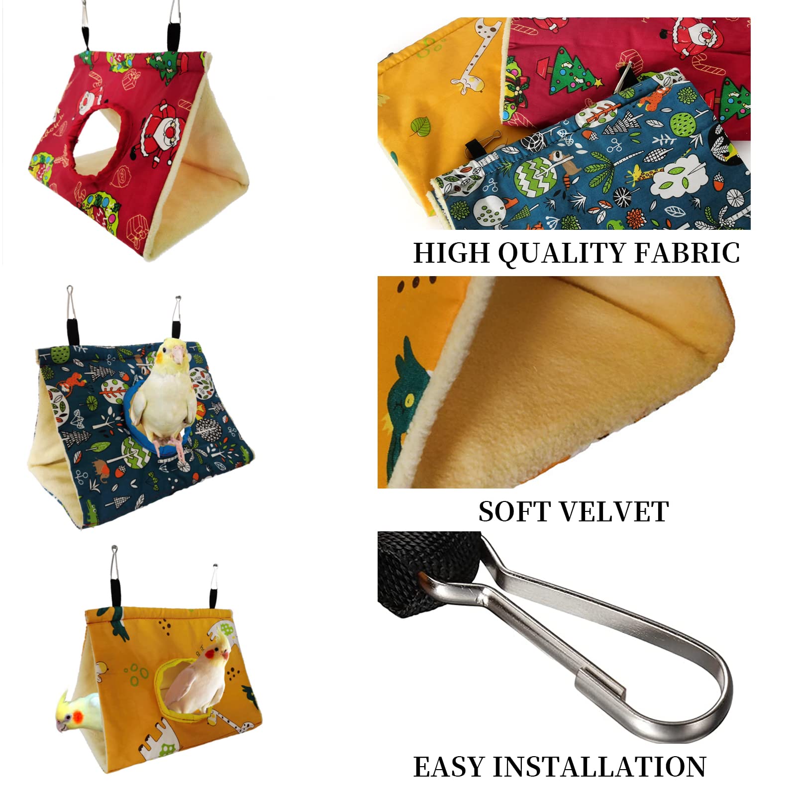 【おしゃれな色】レッド、イエロー、ブルーの3種類のカラーをご用意しております。動物とサンタクロースのデザインは、おしゃれでさらに癒しを与えてくれます。ケージの色やお好みに合わせてお選びください。