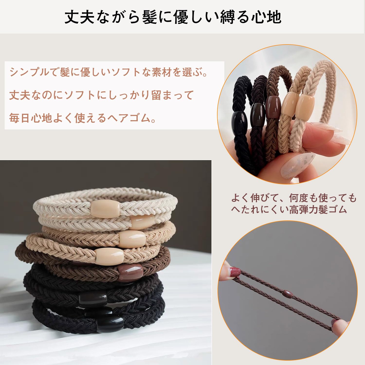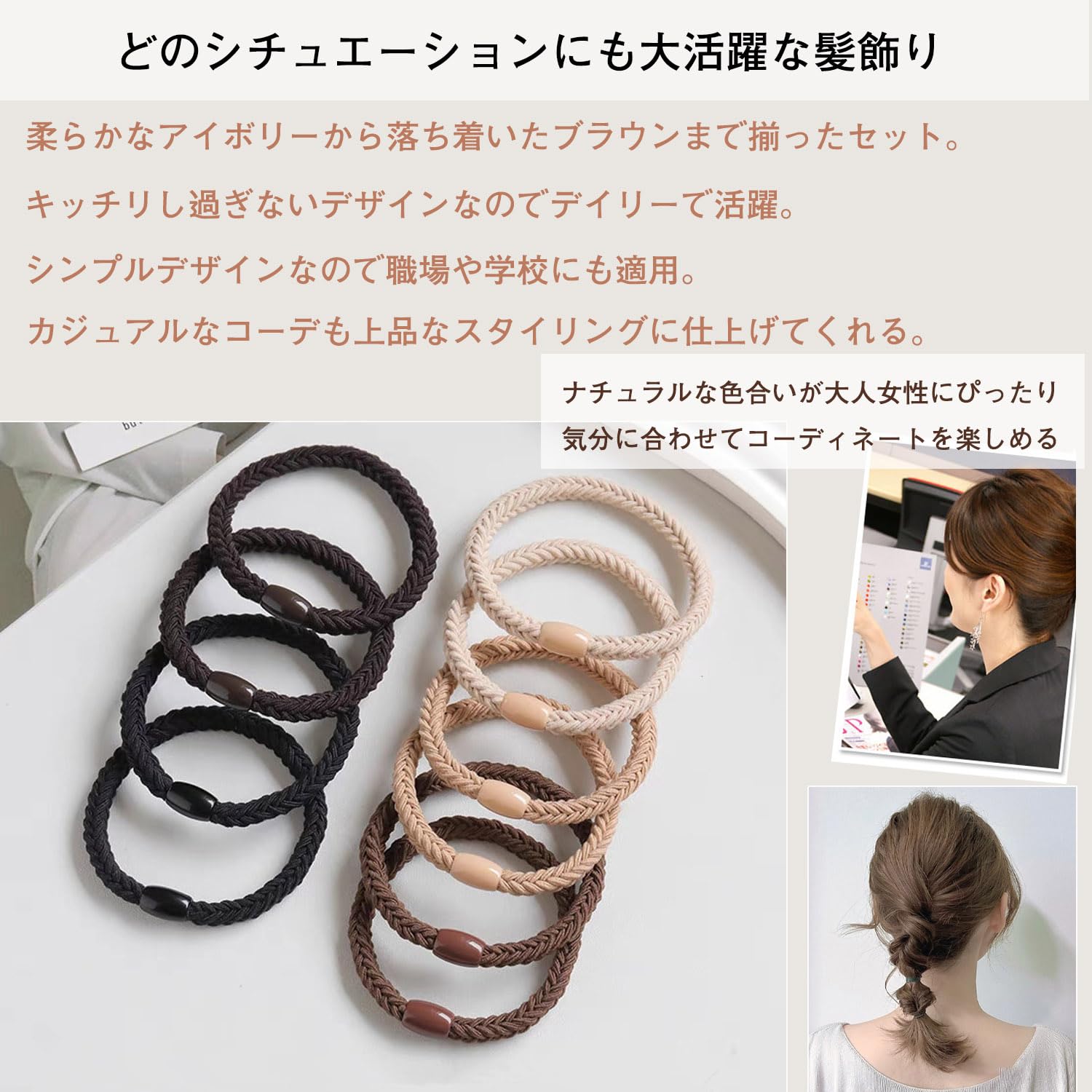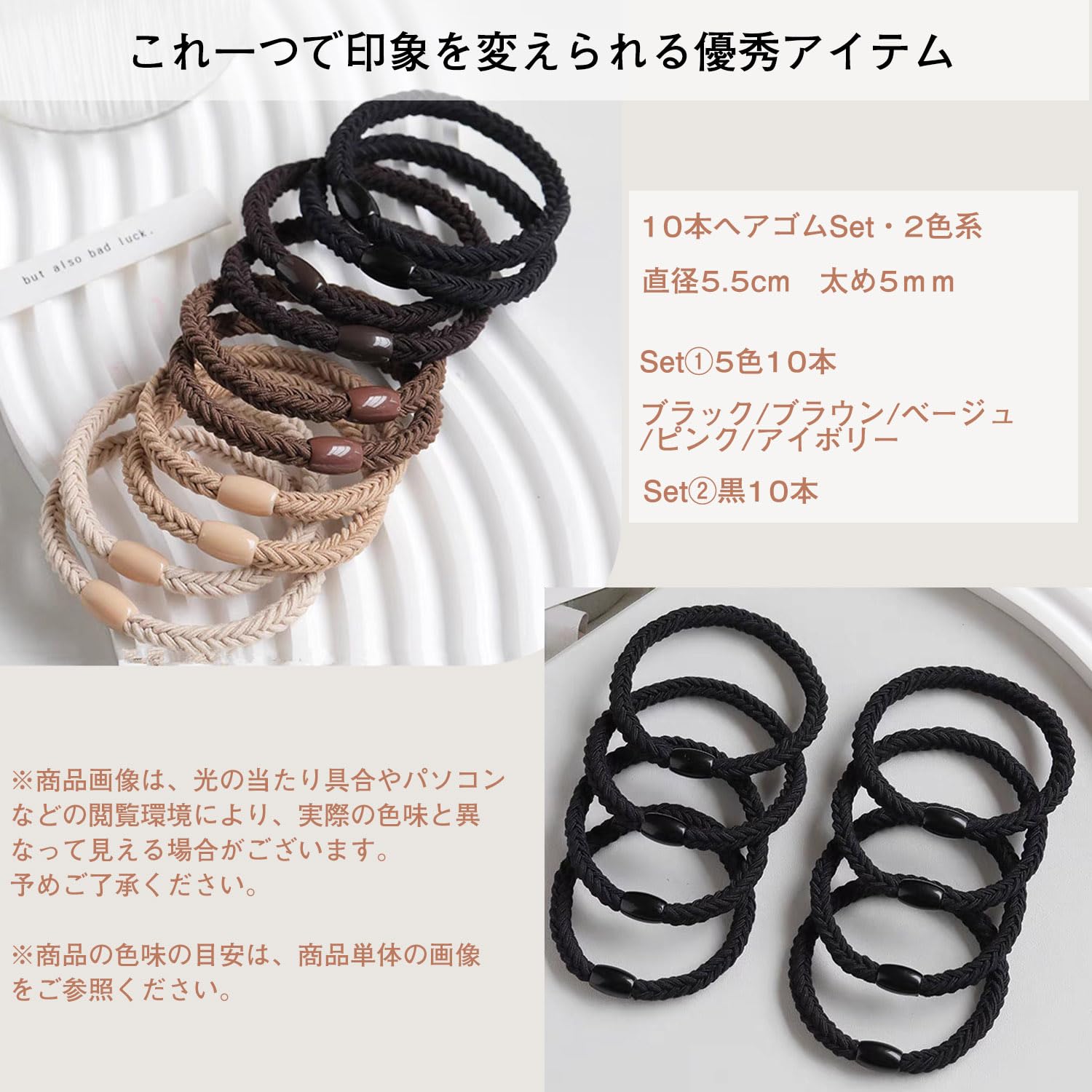 ??【ナチュラル自然に】日本人の髪色と着こなしスタイルに合わせた色味なのできちんとした印象に。【耐久性よい】よく伸びて何度使ってもへたれにくい【商品仕様】○サイズ:直径5.5cm太め5mm ○カラーとセット:ブラック*2本/ダークブラウン*2本/ブラウン*2本/ベージュ*2本/アイボリー*2本○素材:ポリエステル+プラスチック