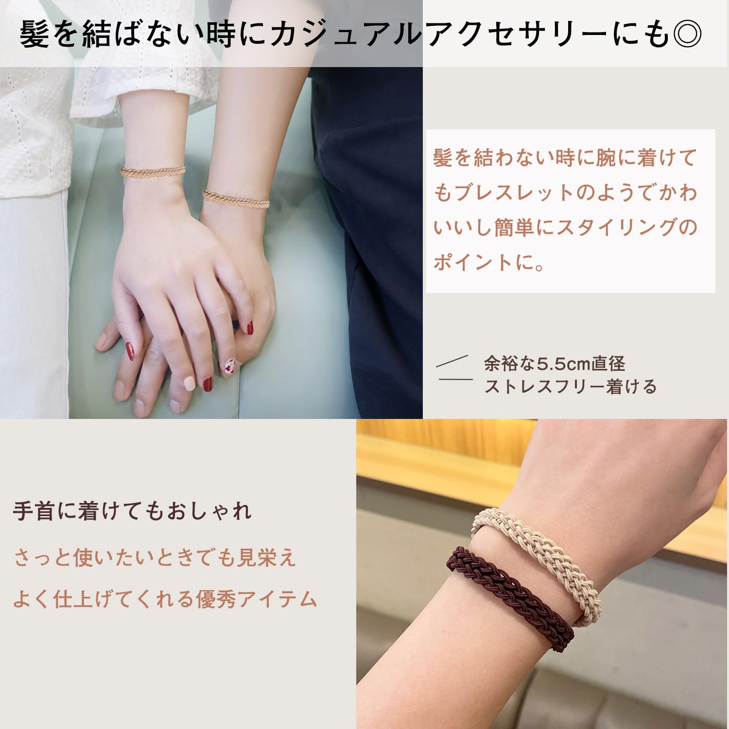 ??【髪飾りだけてなく使いやすい】手軽なヘアアレンジでおしゃれを楽しみたい方にオススメ。カジュアルアクセサリーにも◎余裕な5.5cm直径で、髪を結わない時に腕に着けても、ブレスレットのようでかわいいし簡単にスタイリングのポイントに。