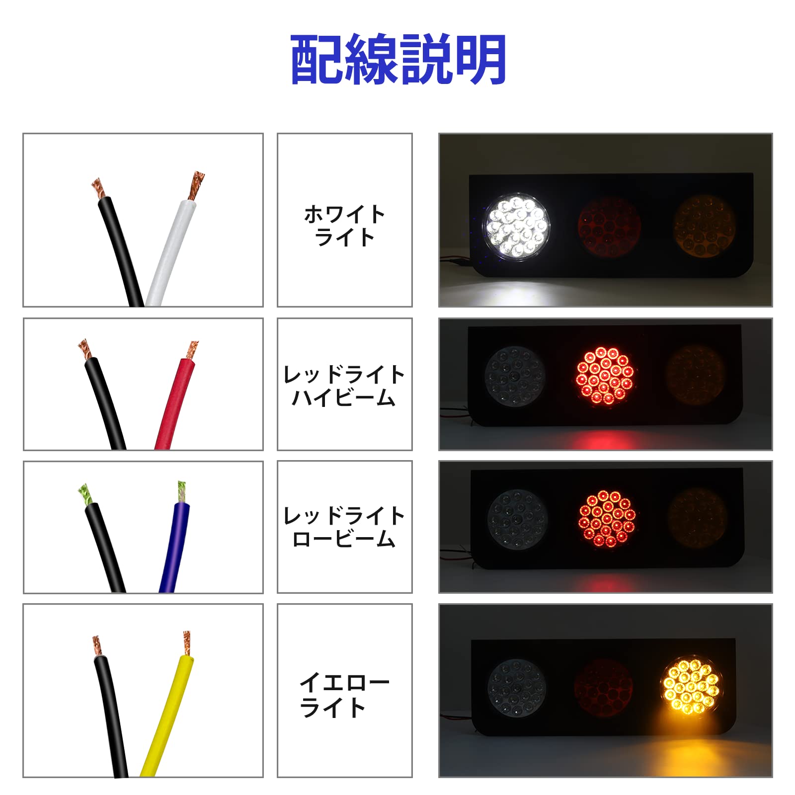 ★【配線説明】①黄ライトは黄色いコード+黒色コード−で点灯、ウインカーとして利用可能です。②赤ライトは2つの輝度がありますが、赤色コード+黒色コード−で配線したら、ハイビームが点灯してブレーキランプに適用。青色コード+黒色コード−で配線したら、ロービームが点灯してスモールとして使用可能。ハイロービームの輝度差がはっきりして、ブレーキ時は簡単に見えます。③白ライトは白色コード+黒色コード−で点灯、バックランプとして使えます。④ちなみに、出荷ロットによっては、トラック テールの配線色が変わったことも可能ですが、発光モードと対応機能を確認してから装着したら、正式使用には支障がないです。予めご了承ください。