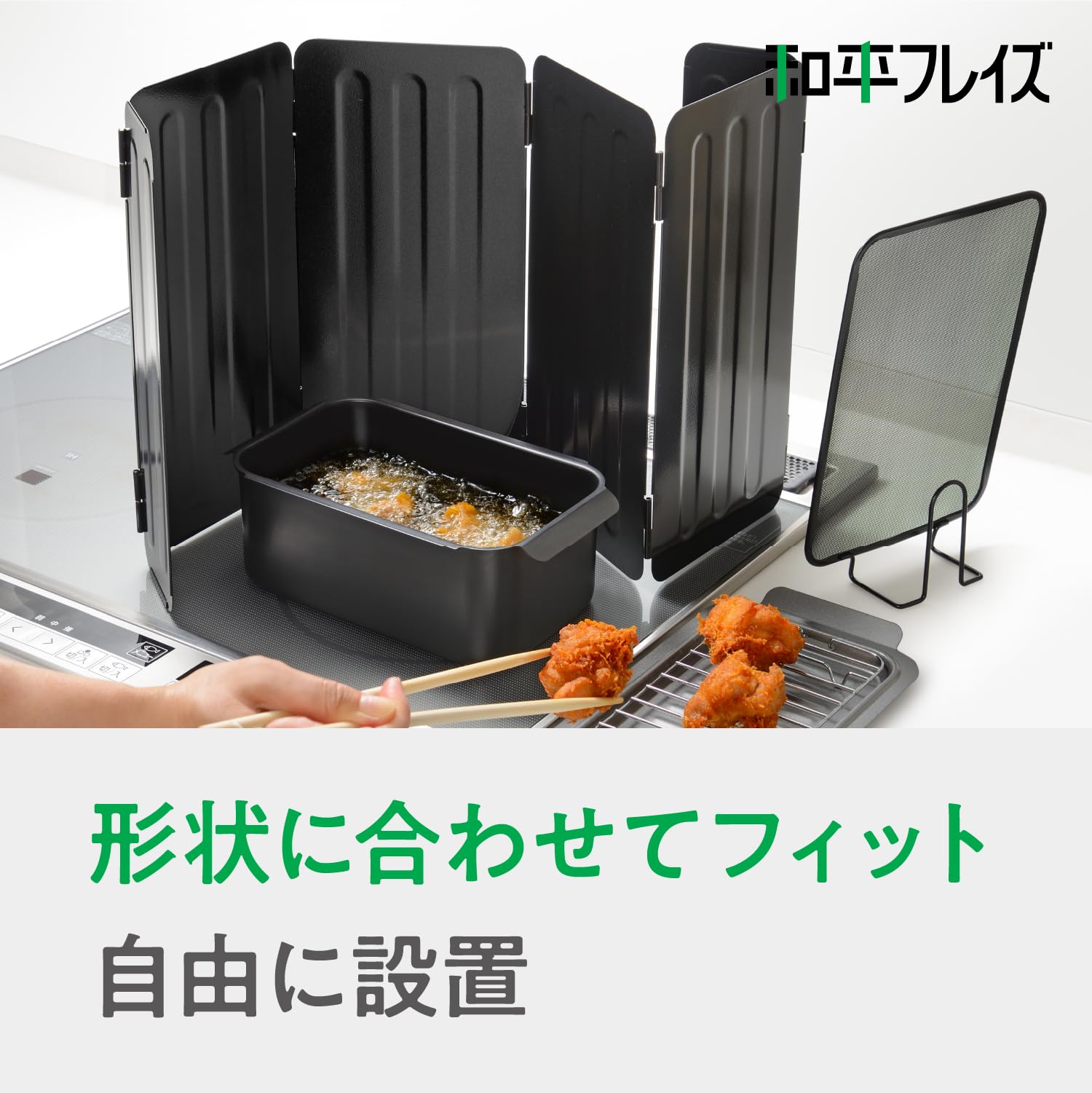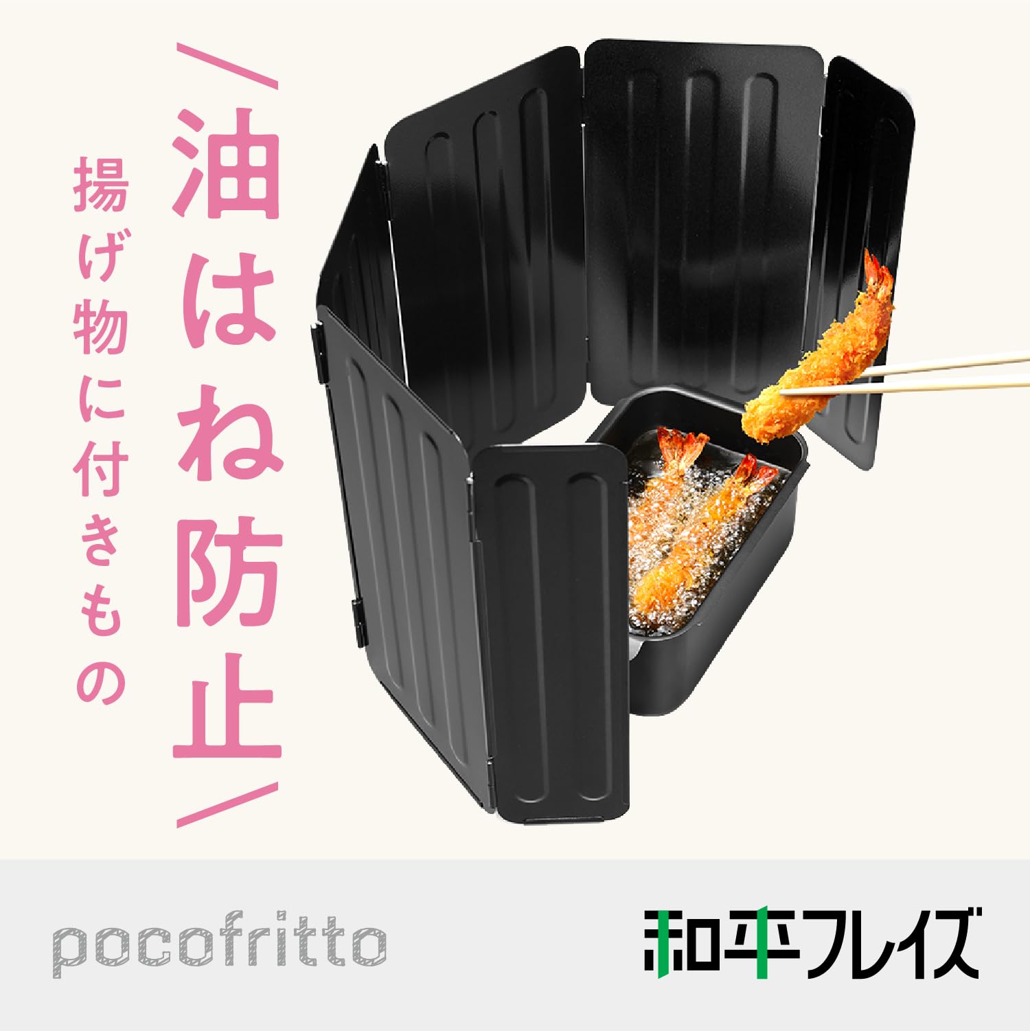 和平フレイズ 油ハネ防止 オイルガード 折りたたみ レンジガード ポコフリット RD-0099 本体:鉄、表面加工:ふっ素樹脂加工 商品サイズ(約):幅76×奥行5×高30cm 商品重量(約):970g 生産国:中国 ●料理中の油ハネ・飛び散りを効果的に防ぐアイテムです。●蛇腹に折りたたんだパネルを広げるだけで簡単に設置できます。●壁面にこびりつく油汚れも減少し、お掃除の手間を軽減します。