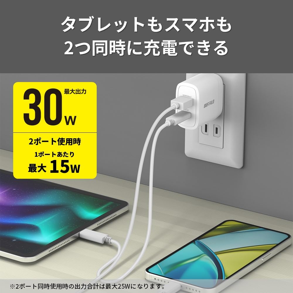 【新着特価】バッファロー 充電器 30W 2ポート Type-C Type-A USB PD Power Delivery 3.0 急速充電 GaN 窒化ガリウム 折り畳み式 コンセント プラグ PSE適合 【 iPhone 17 / 16 / 15 / iPad/Android 対応】 BSACPD3005C2WH