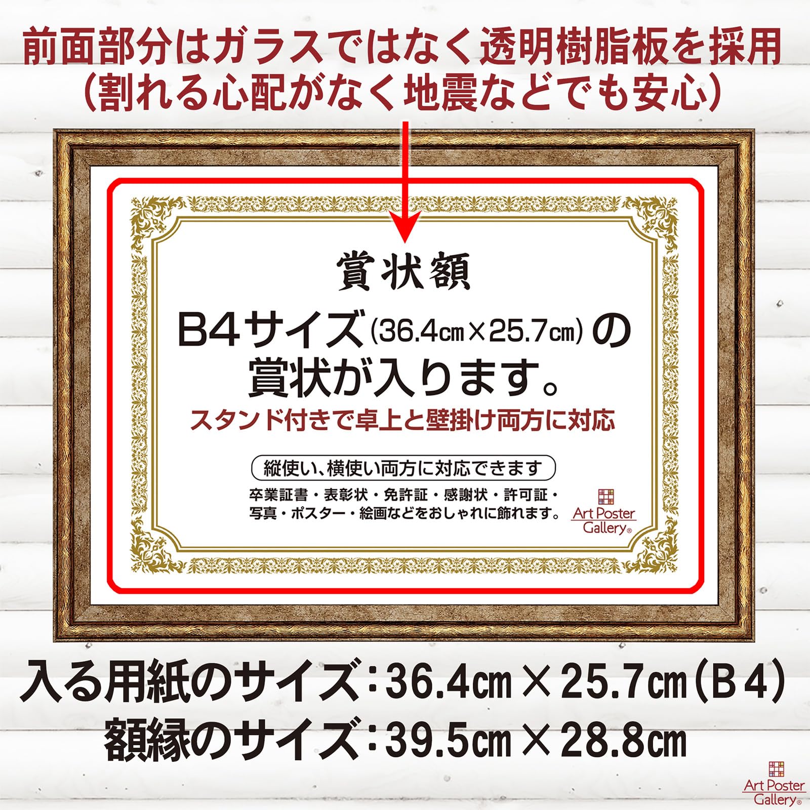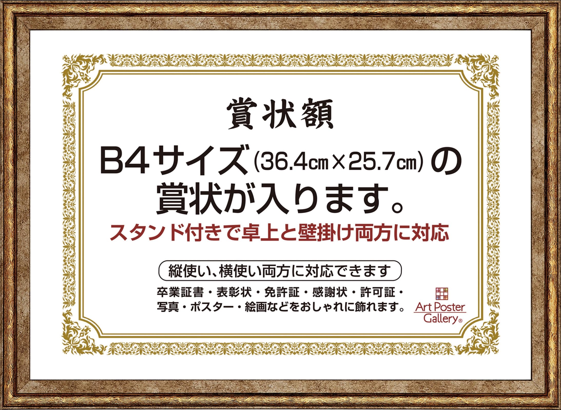 賞状 額縁 B4 サイズ 金色 ゴールド 横 縦 フォトフレーム 卓上 壁掛け 写真立て 写真入れ ポスターフレーム