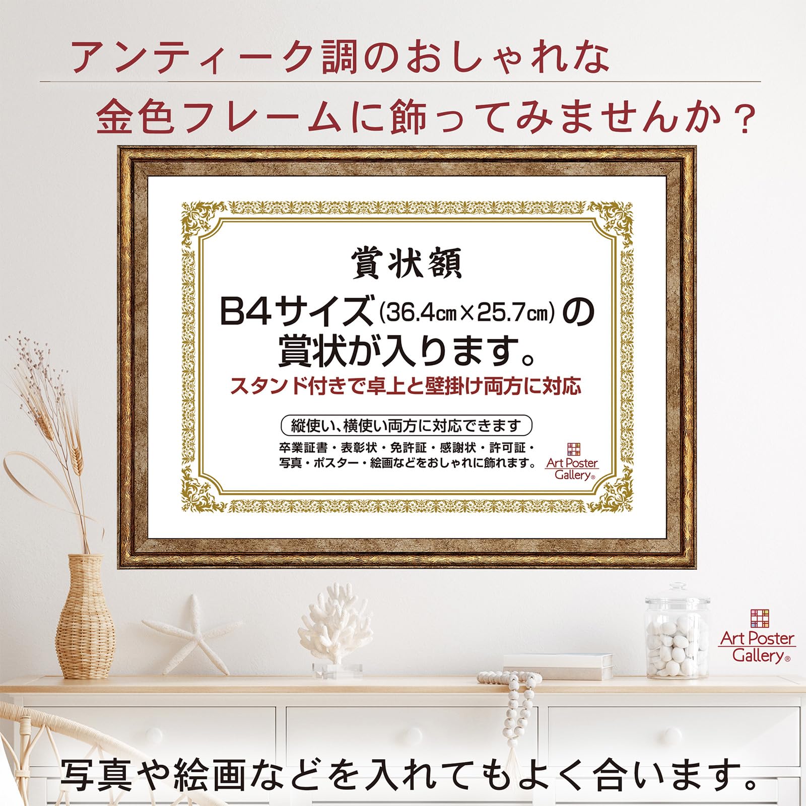 【特徴1】金色のアンティーク調の額縁です。コンクールや大会で得た賞状や表彰状・卒業証書・免許証・感謝状・功労賞・認定書・修了書などをおしゃれに飾れます。また写真・絵画・ポスターなどにもよく合います。