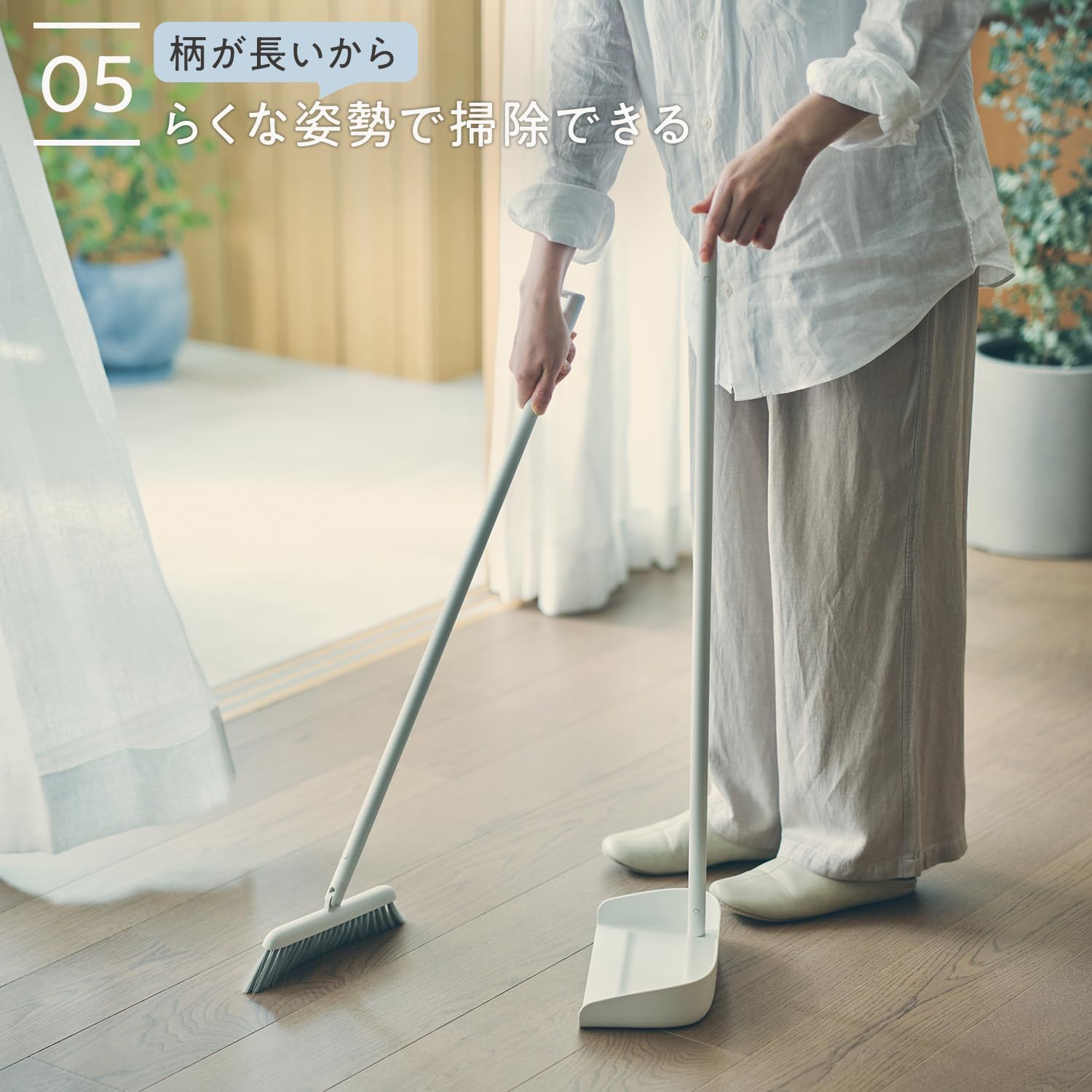 【柄が長くて掃きやすい、立たせてすっきり収納】柄が長く掃きやすいほうきと、ゴミがこぼれにくいちりとりのセットです。ちりとりの柄の先端にほうきのフックを置くだけで簡単に収納できます。