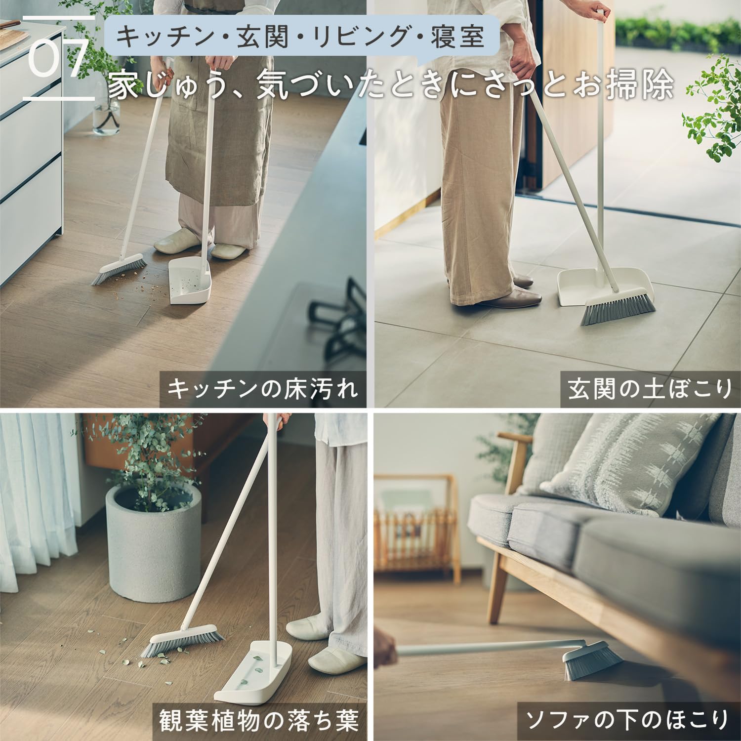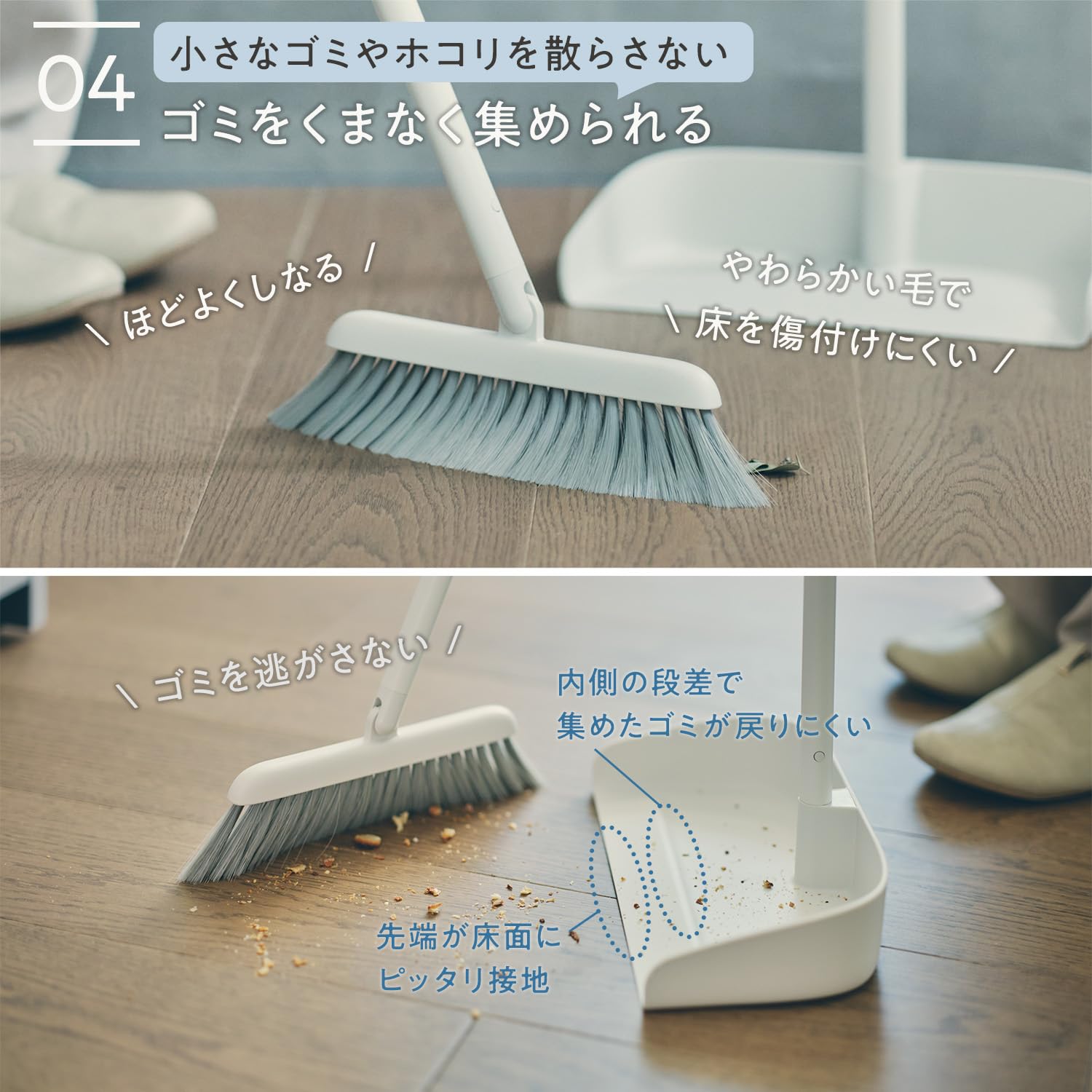 【小さなゴミやホコリを散らさない】ほどよくしなるやわらかい毛で床を傷つけにくいので室内の掃き掃除も安心。ちりとりの先端は床面にピッタリ設置、内側にはゴミが戻りにくい段差がありゴミを逃がさない設計です。
