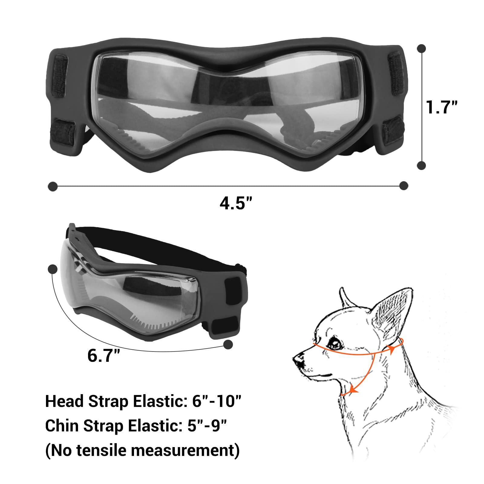 調整可能ベルト:頭部ベルト:15cm - 25cm;あごベルト:13cm - 23cm。ペットに合うサイズまで調整可能。ペットにゴーグルのかけることを慣れられるまで訓練しよう。