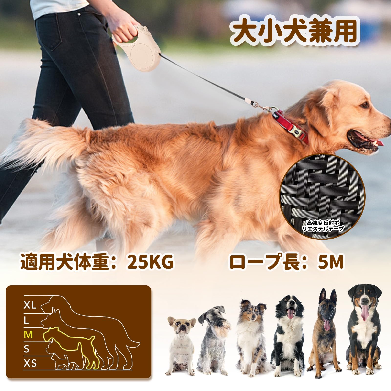 犬 リード 伸縮 ロングリード 自動巻き ストラップ付き リフレクター 小・中型犬用 [長さ:5m 適応体重30kg]