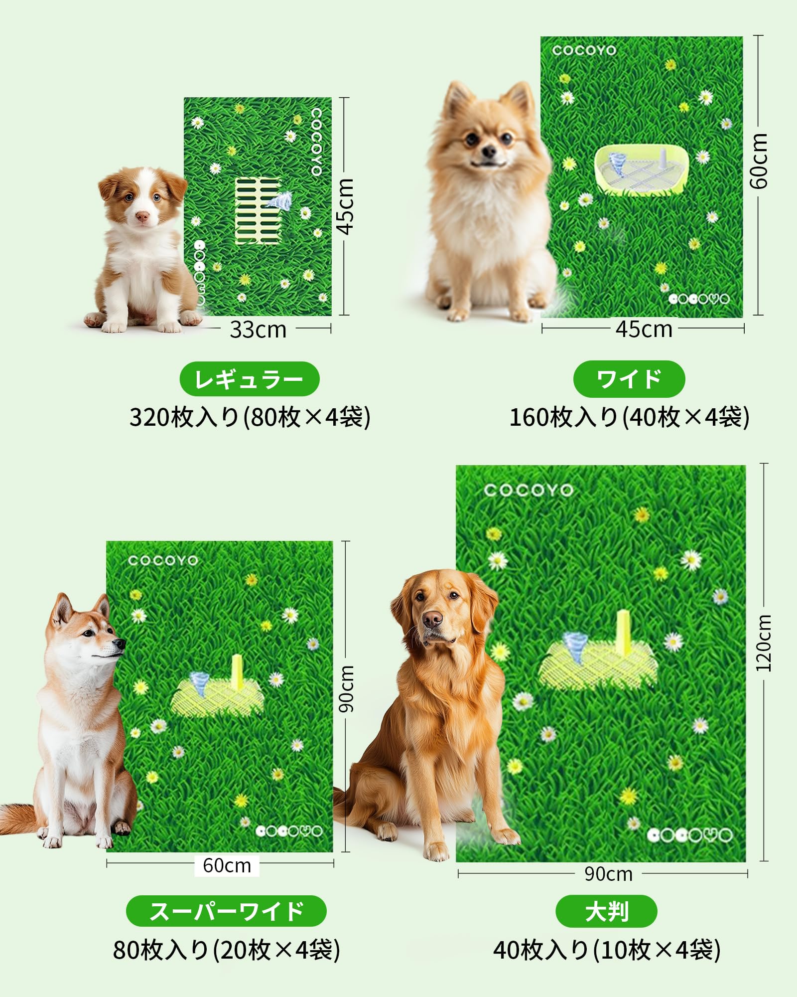 【芝生柄付き&トレーニング簡単】COCOYO青青芝生ペットシーツは芝生をイメージしたデザインで、愛犬が自然を感じながらトイレを使うことができます。視覚的に愛犬の興味を引きつける3種類の3Dデザインを搭載し、トイレトレーニングを簡単に進めることができます。絵柄については商品詳細ページをご参照ください。