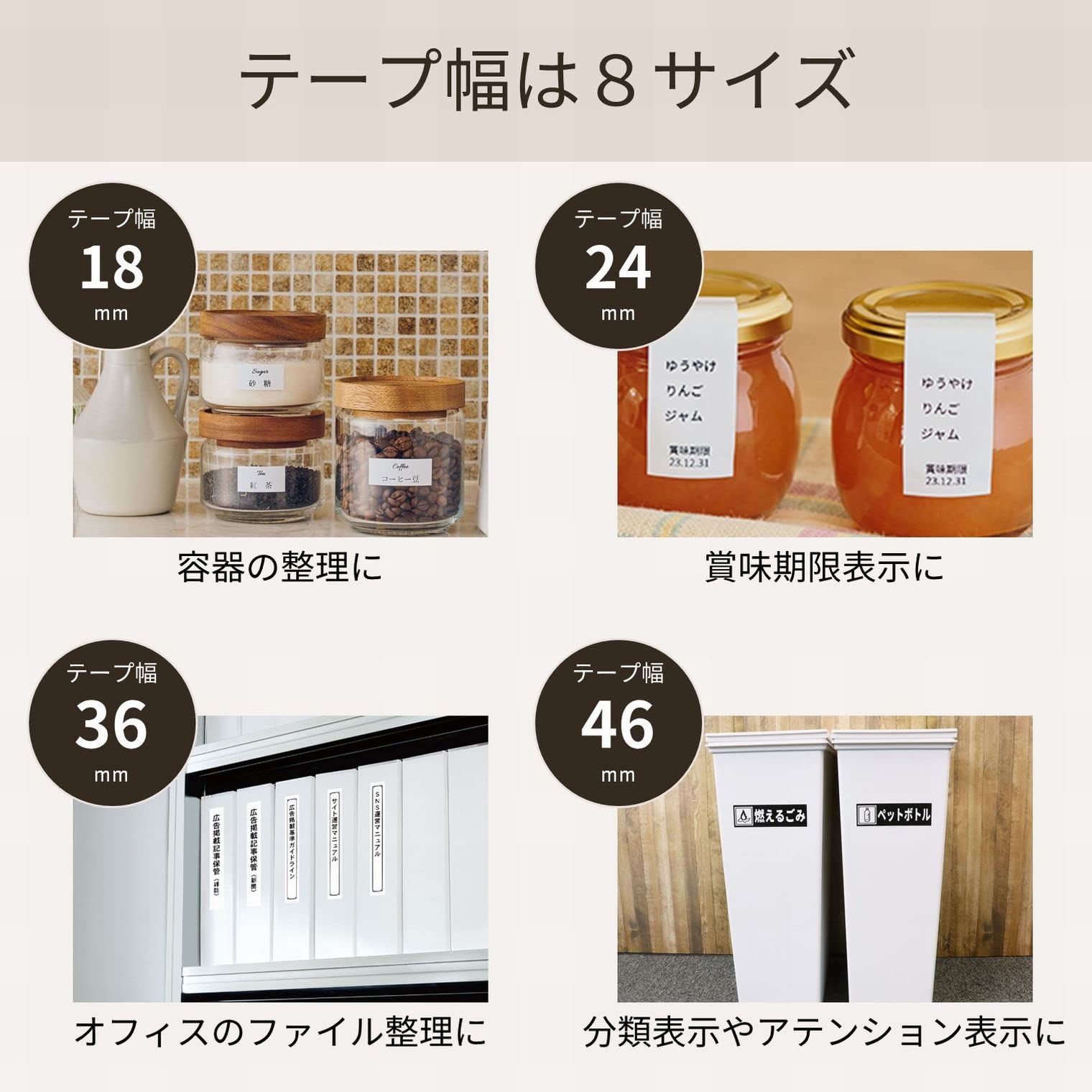 ビジネスからホームまで幅広いシーンでのラベル作成に対応し、使い方はいろいろ。 各自の持ち物や収納ボックスに名前を付けたりと整理整頓に役立つ。 定番の白地に黒文字テープ3本セット。