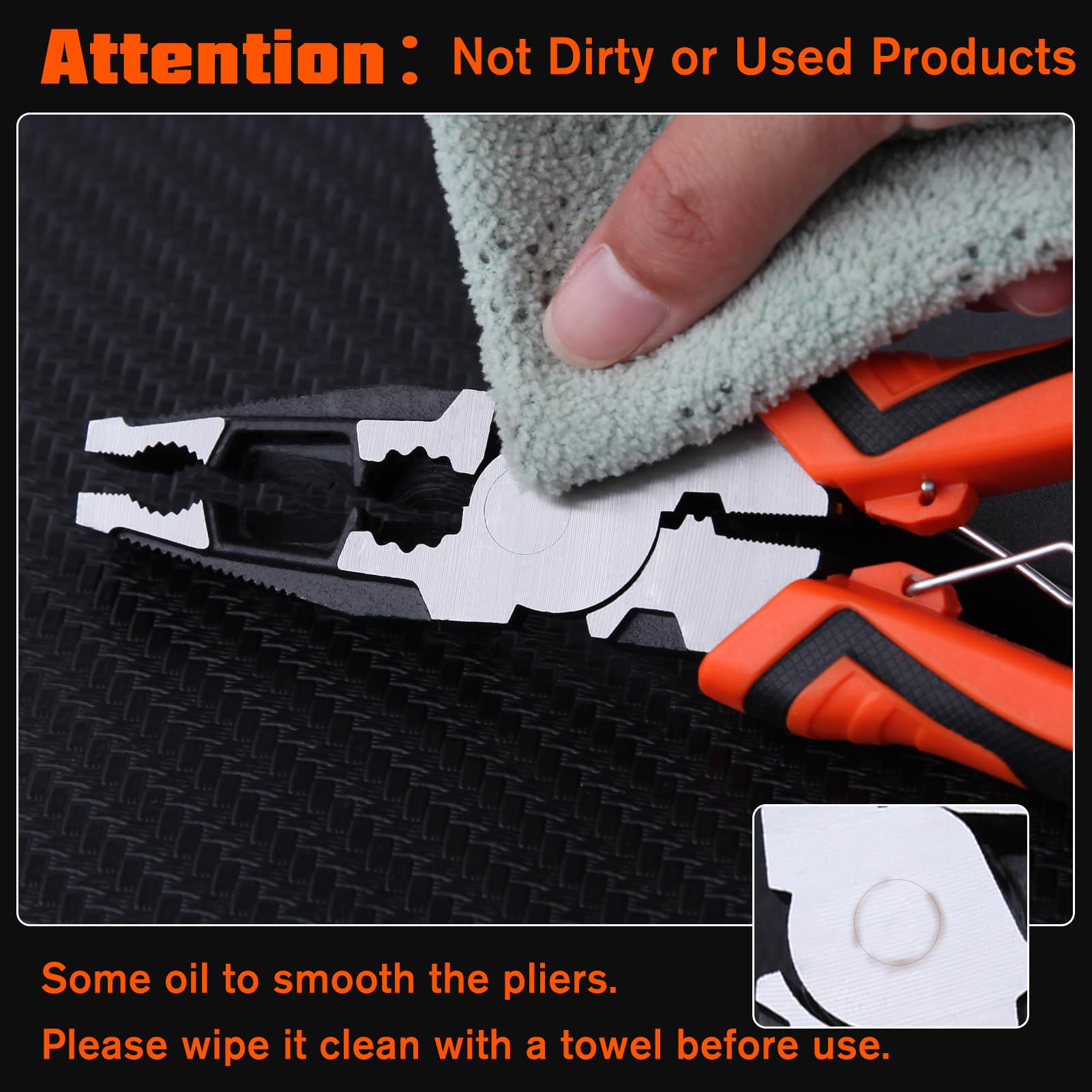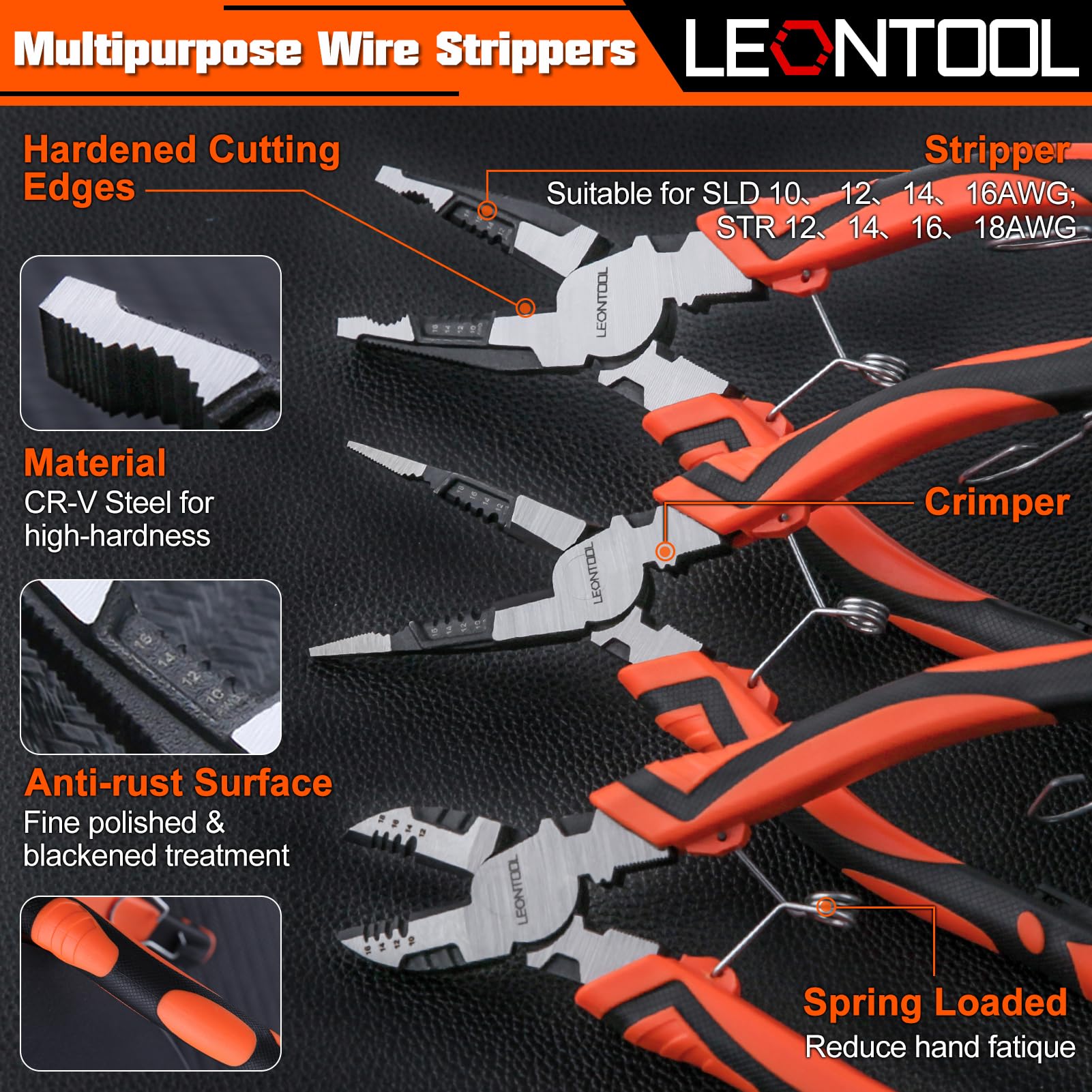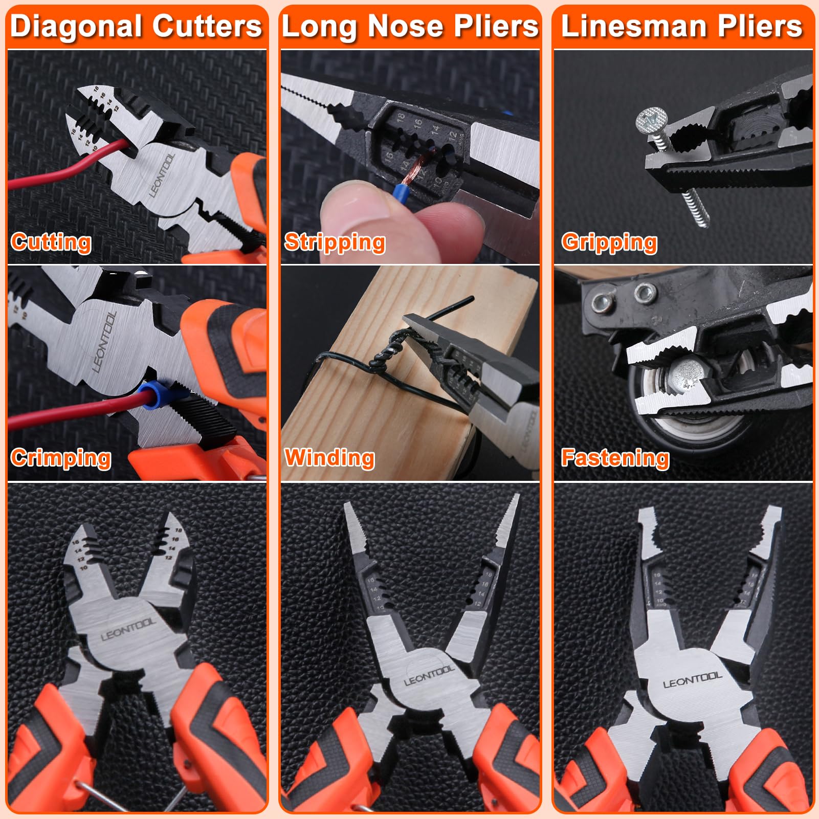 多機能: 巻き取り、切断、ストリッピング、クランプ、締め付け、圧着などの機能を備えた多機能プライヤーセット。SLD:10、12、14、16AWG;STR:12、14、16、18AWGのワイヤーに適しており、ワイヤーの芯を傷つけずに簡単にストリップできます。電気技師、配管工、大工、自動車整備士、すべてのDIY愛好家に最適。