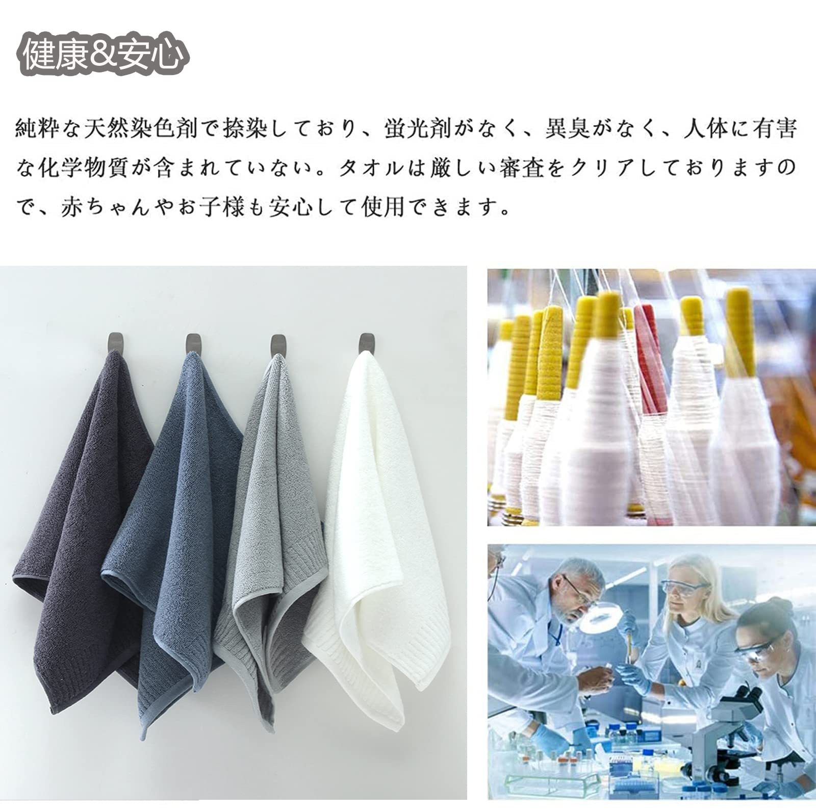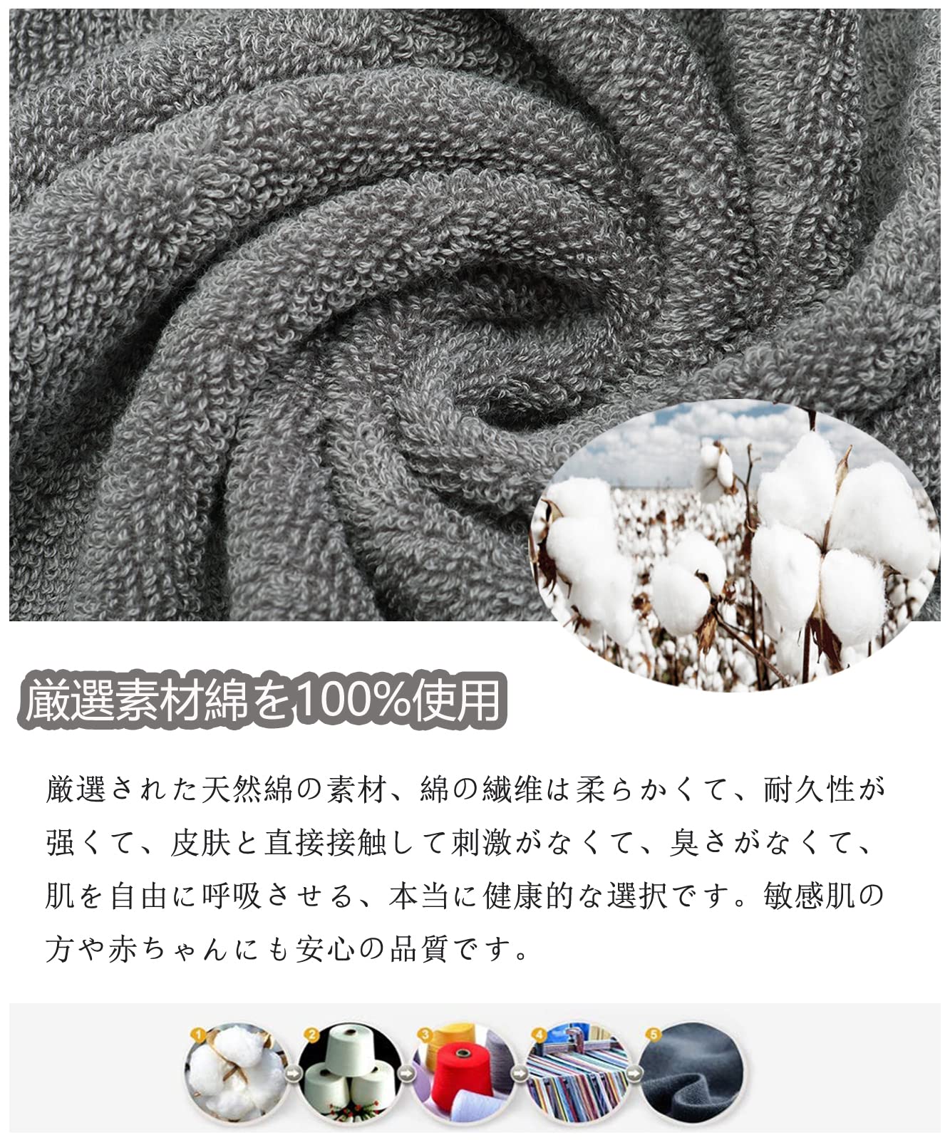 ?【優れた品質】厳選された100%天然綿の素材、蛍光染料は使用しておりません、優しく柔らかい肌触り、優れた通気性。安全で快適な使い心地が備わっているので、赤ちゃんや敏感肌の方にも安心してご使用頂けます。高密度で織ったことで、洗濯しても変形しにくく、長持ちできる、色移りの心配もありません。普通のタオルよりも長く使います。