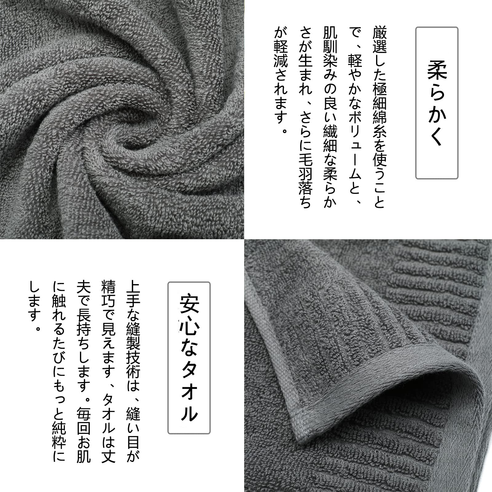 ?【フェイスタオル 6枚セット】素材:綿100% 、サイズ:約35x71cm 、重量:1枚あたり 約100g 、セット内容:ライトグレー2枚+ダークグレー2枚+ブルー2枚。※洗濯機の注意:パイル抜けや毛羽落ちを防ぐには、洗濯機て洗うことをおすすめしません。※綿製品だからタオルの表面に毛羽が付く場合がありまして、初回洗濯時多少毛羽落ちますので、単独でのお洗濯をおすすめします。漂白剤無し、30度以下の水温で2〜3回単独洗いをオススメしております。