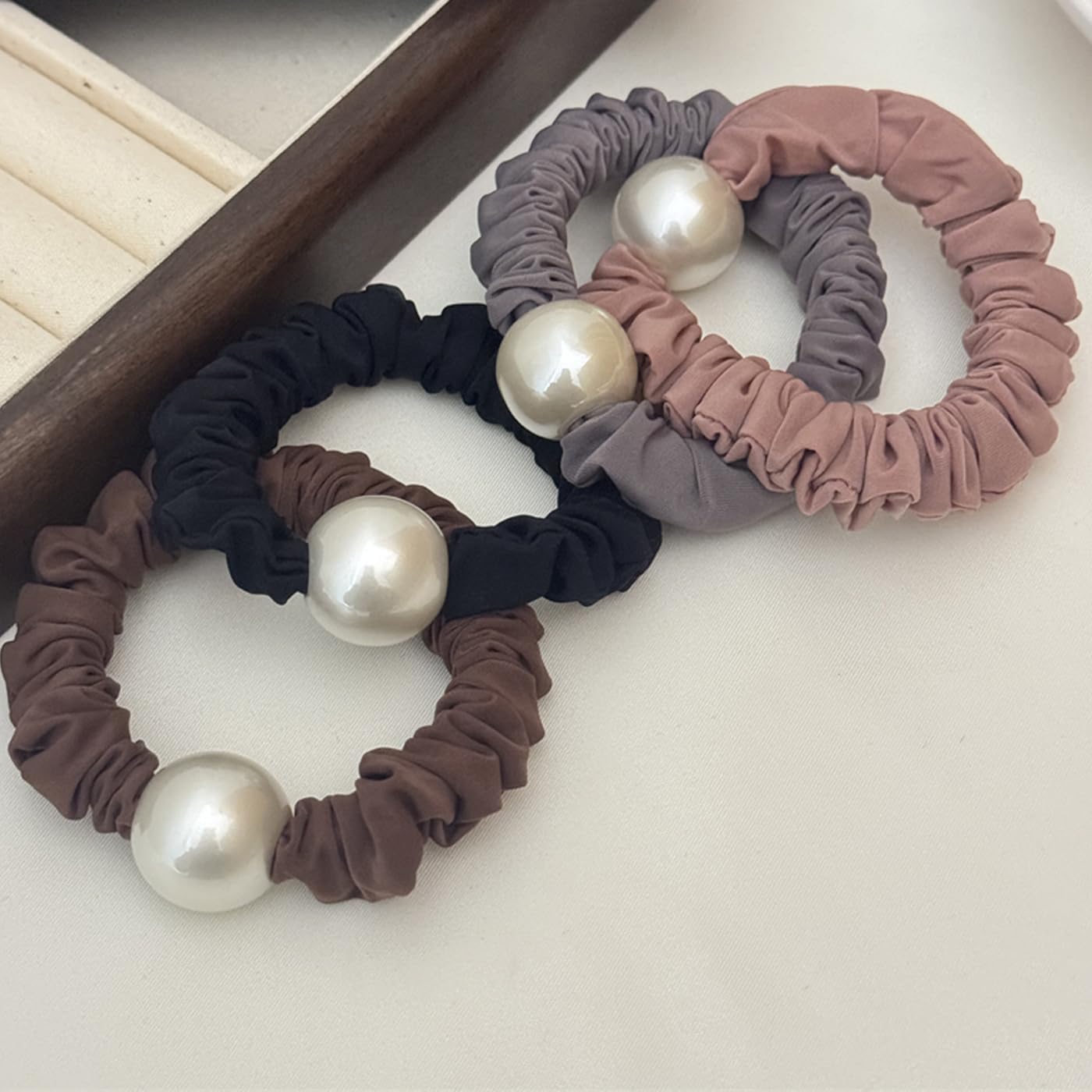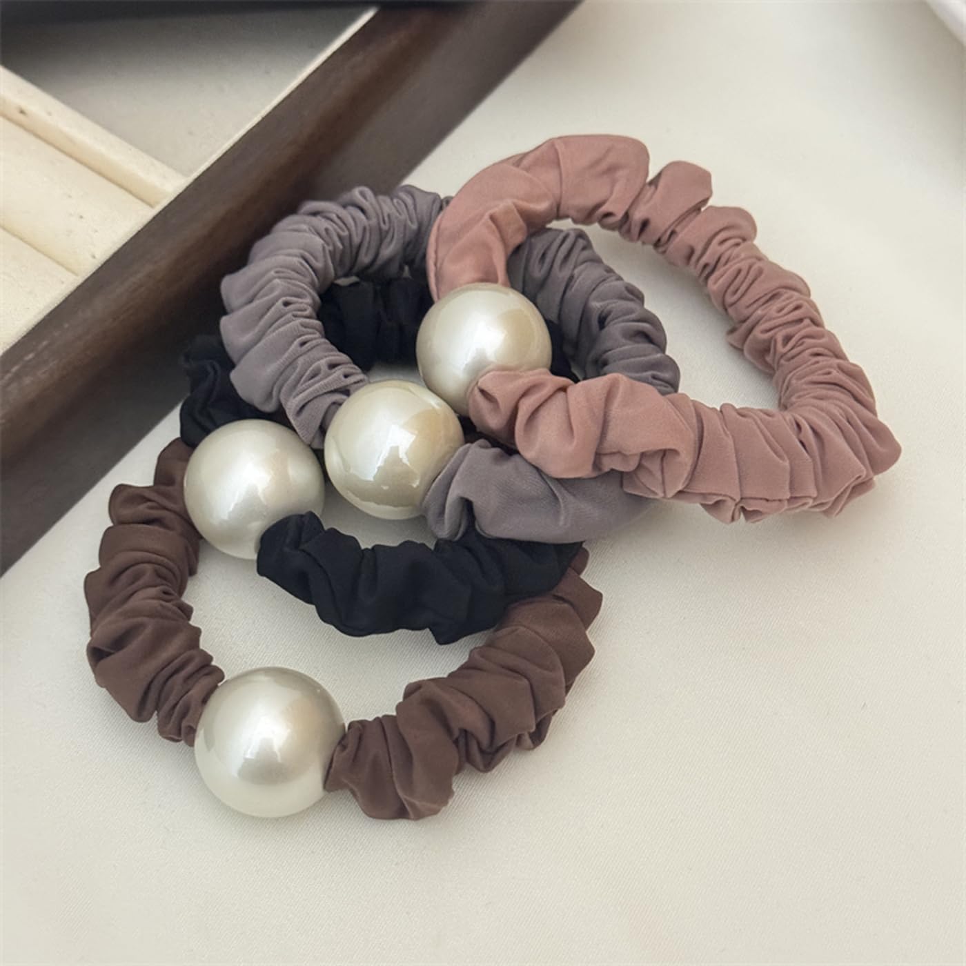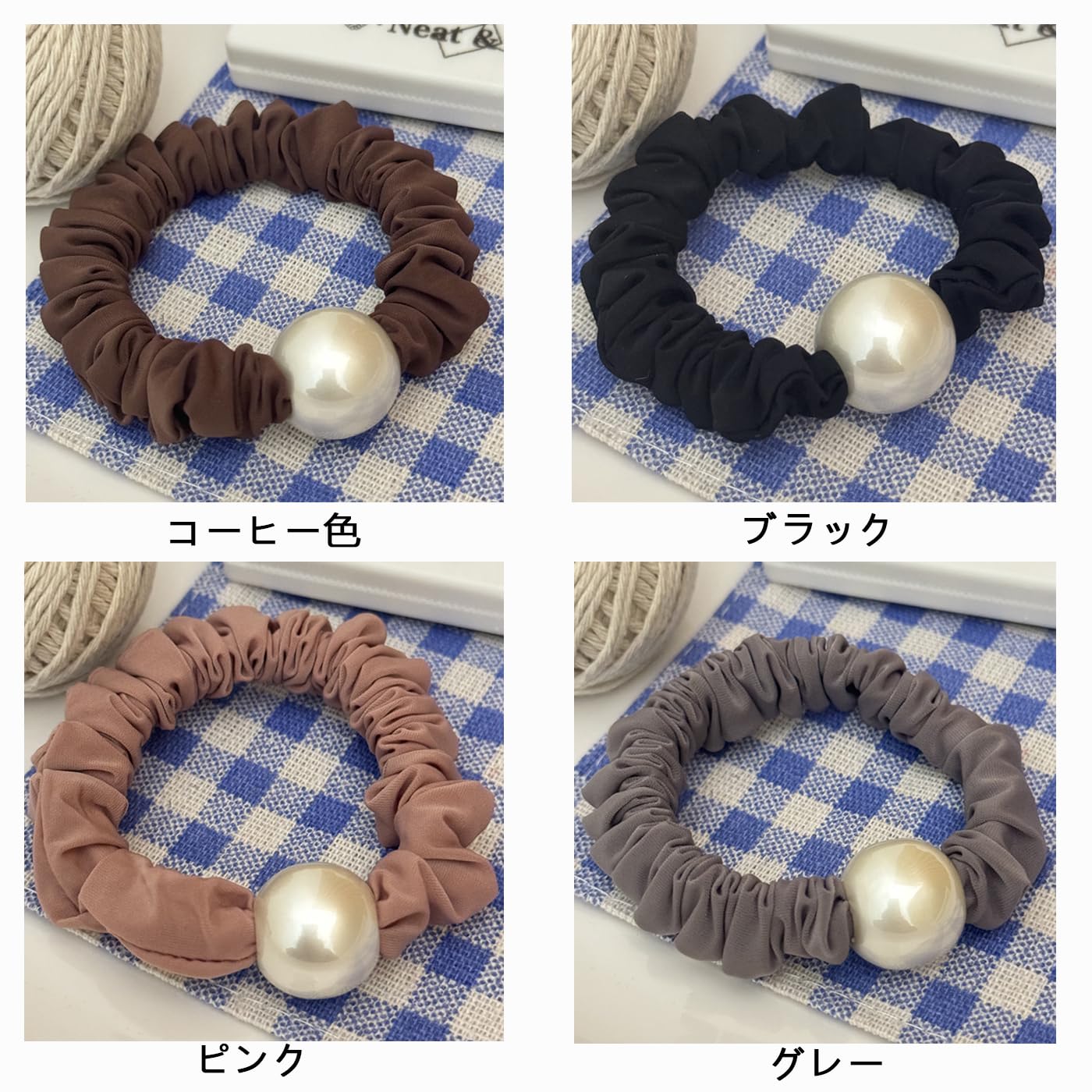 ?【商品詳細】:パール シュシュ 4個セット。サイズ:直径約7 cm、重量:約7 g、材質:シルク+ゴム+パール、色:ブラック&ピンク&グレー&コーヒー色。パール ヘアゴムは触ってみると柔らかくて、感触が気持ちいいです。