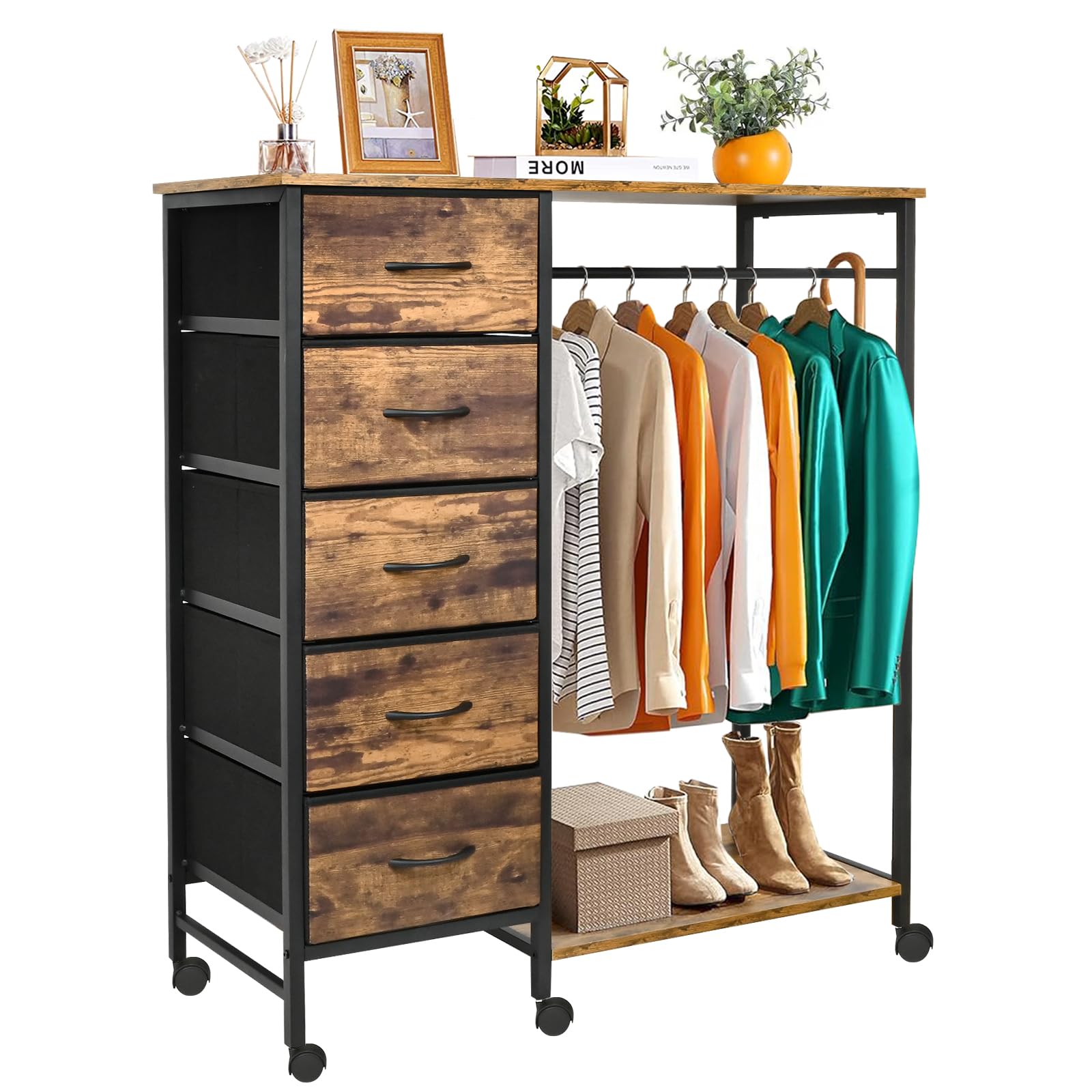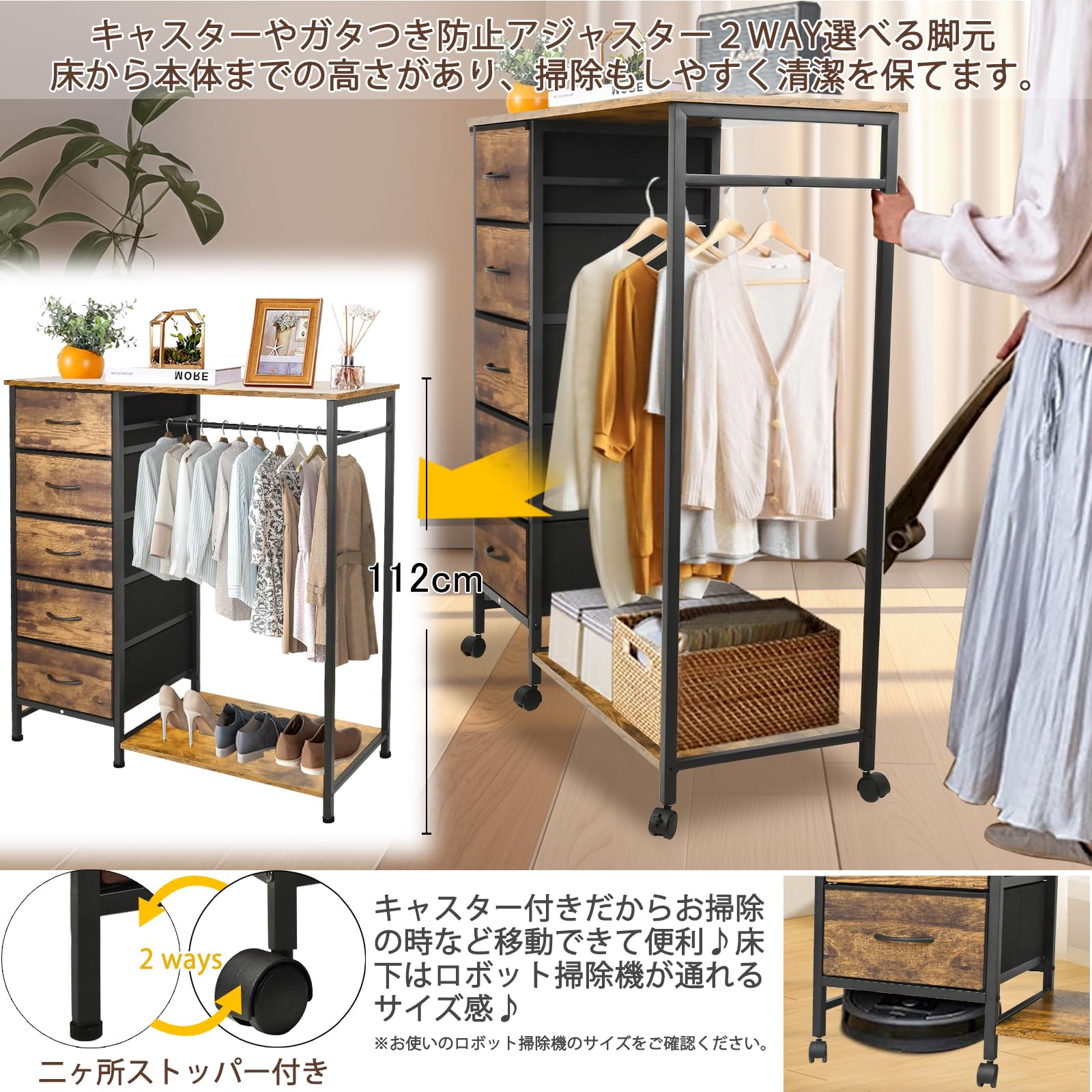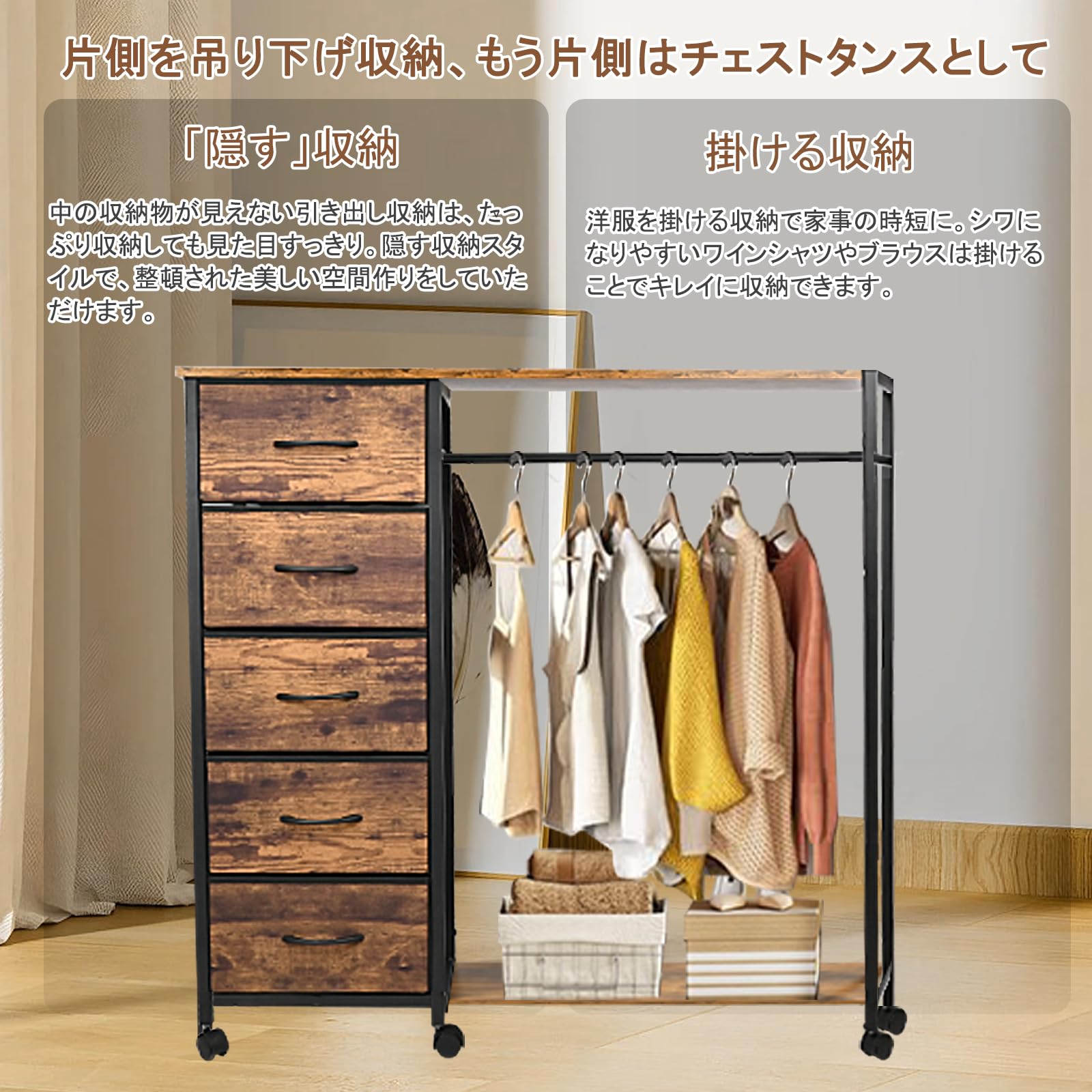 ハンガーラック 頑丈 チェスト タンス 5段 木製 キャスター付き 引き出し 棚 収納付き 幅102×奥行40×高さ112cm 衣類収納 2年